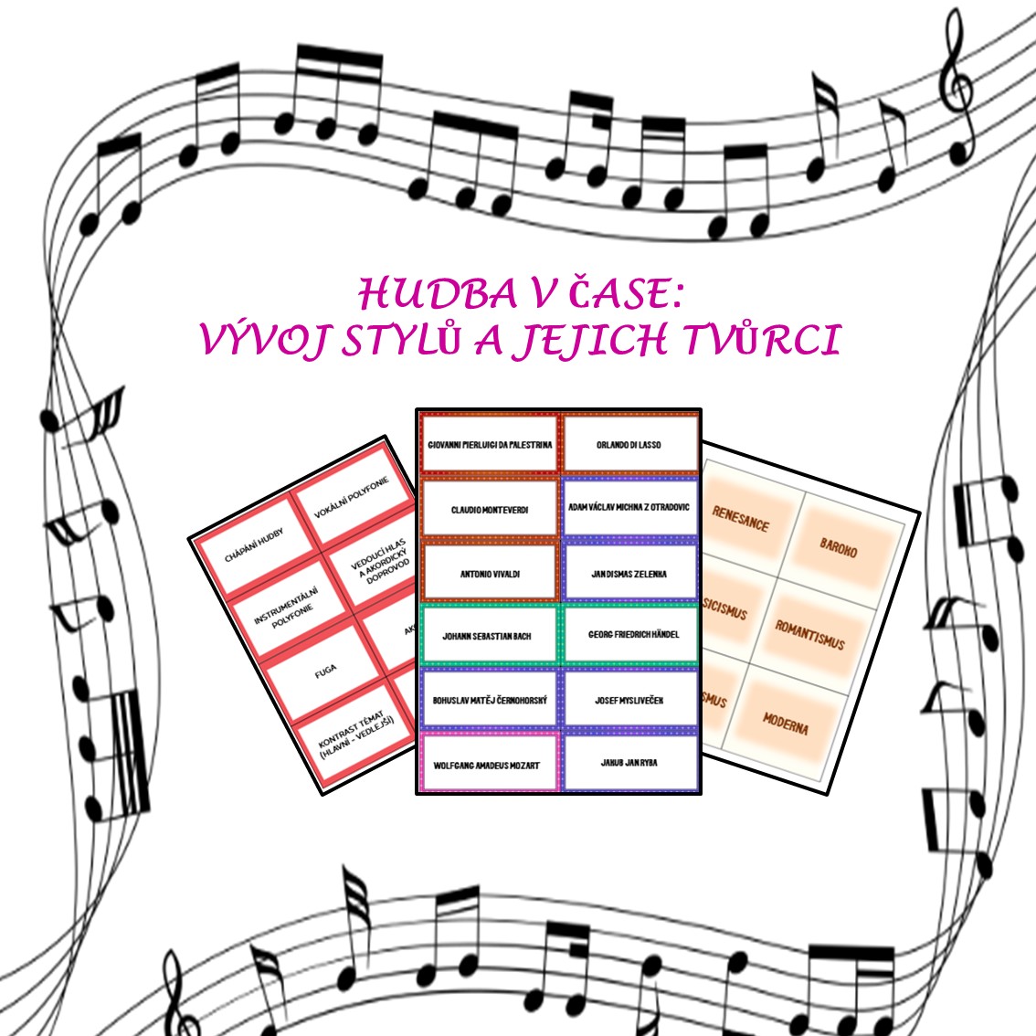 romantismus, impresionismus). - Kartičky se jmény hudebních skladatelů, které jsou barevně rozlišeny podle národnosti.