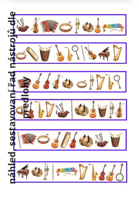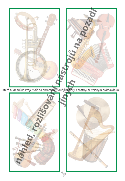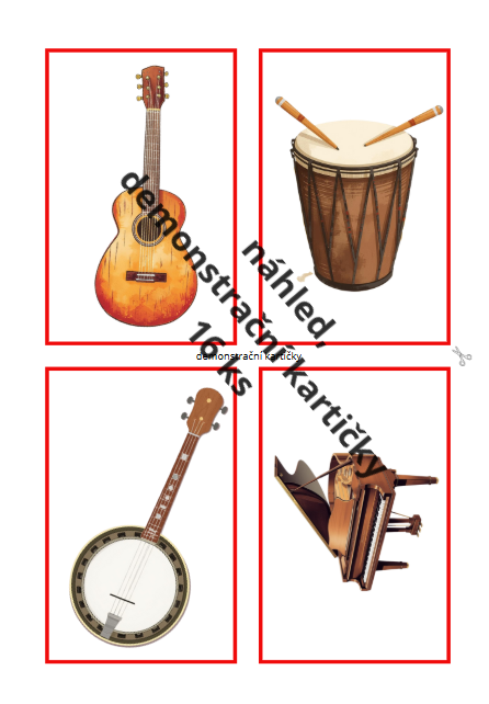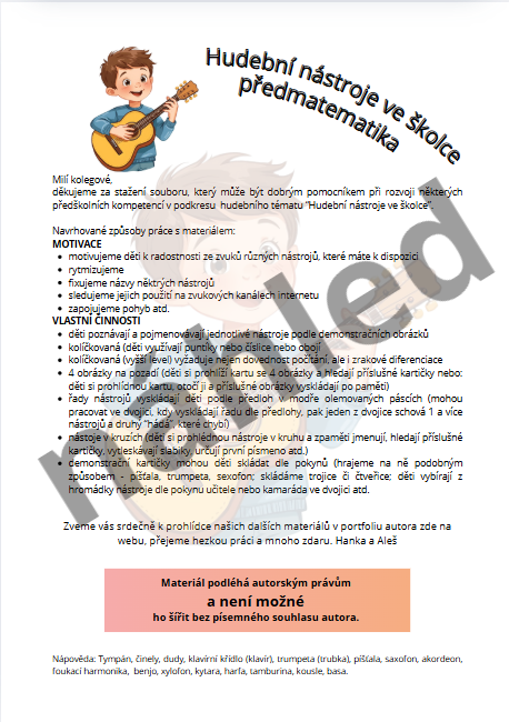 připravili jsme soubor, který může být dobrým pomocníkem při rozvoji některých předškolních kompetencí v podkresu hudebního tématu “Hudební nástroje ve školce (předmatematika)”.