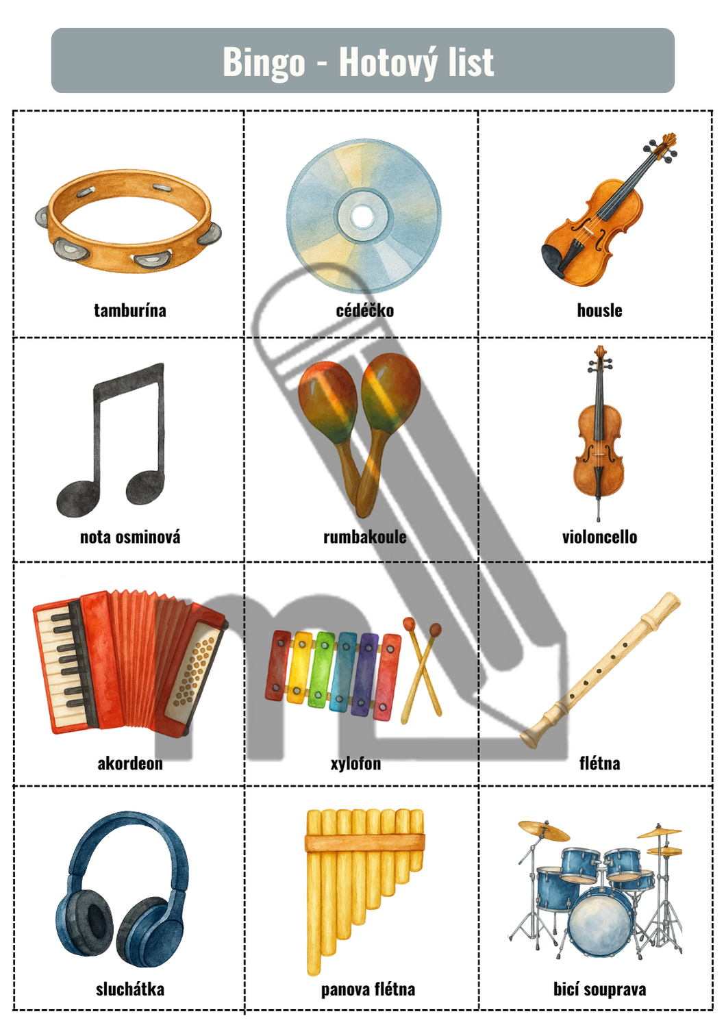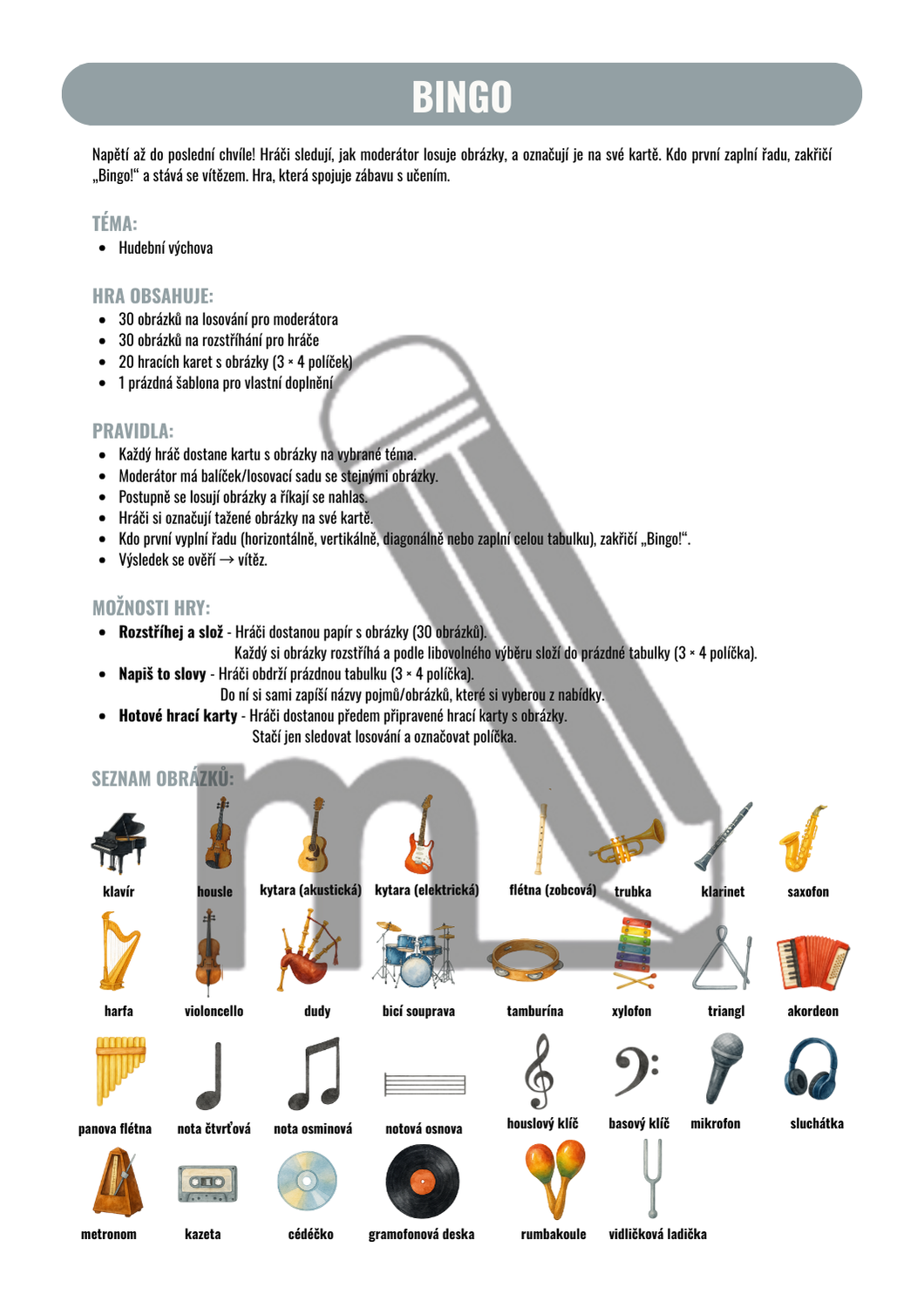 20 hracích karet s připravenými obrázky (3 × 4 políček)