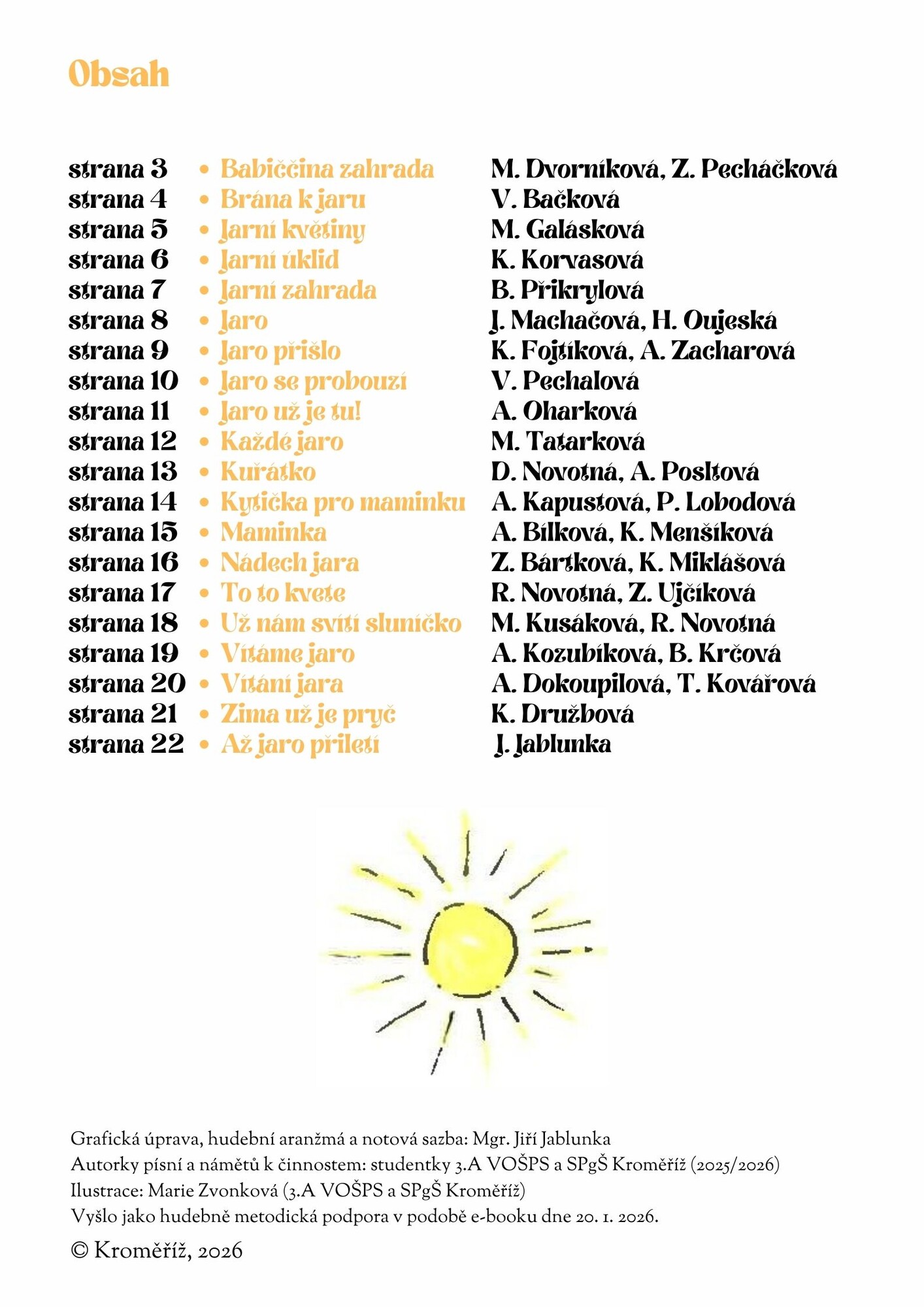 - autorkami básní a písní k nim jsou žákyně Hudební výchovy s metodikou a jejich vyučující Mgr. Jiří Jablunka na SPgŠ Kroměříž