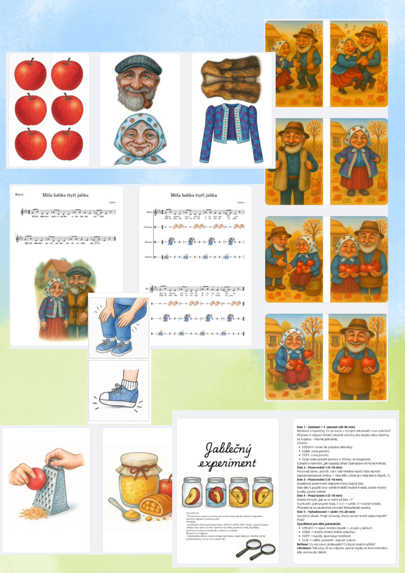 Balíček „Měla babka čtyři jabka“ propojuje hudbu, pohyb, pokusy i tvoření. Vše je metodicky zpracované podle nového RVP PV, takže máte jistotu, že aktivity plní vzdělávací cíle a zároveň jsou pro děti zábavné a poutavé.