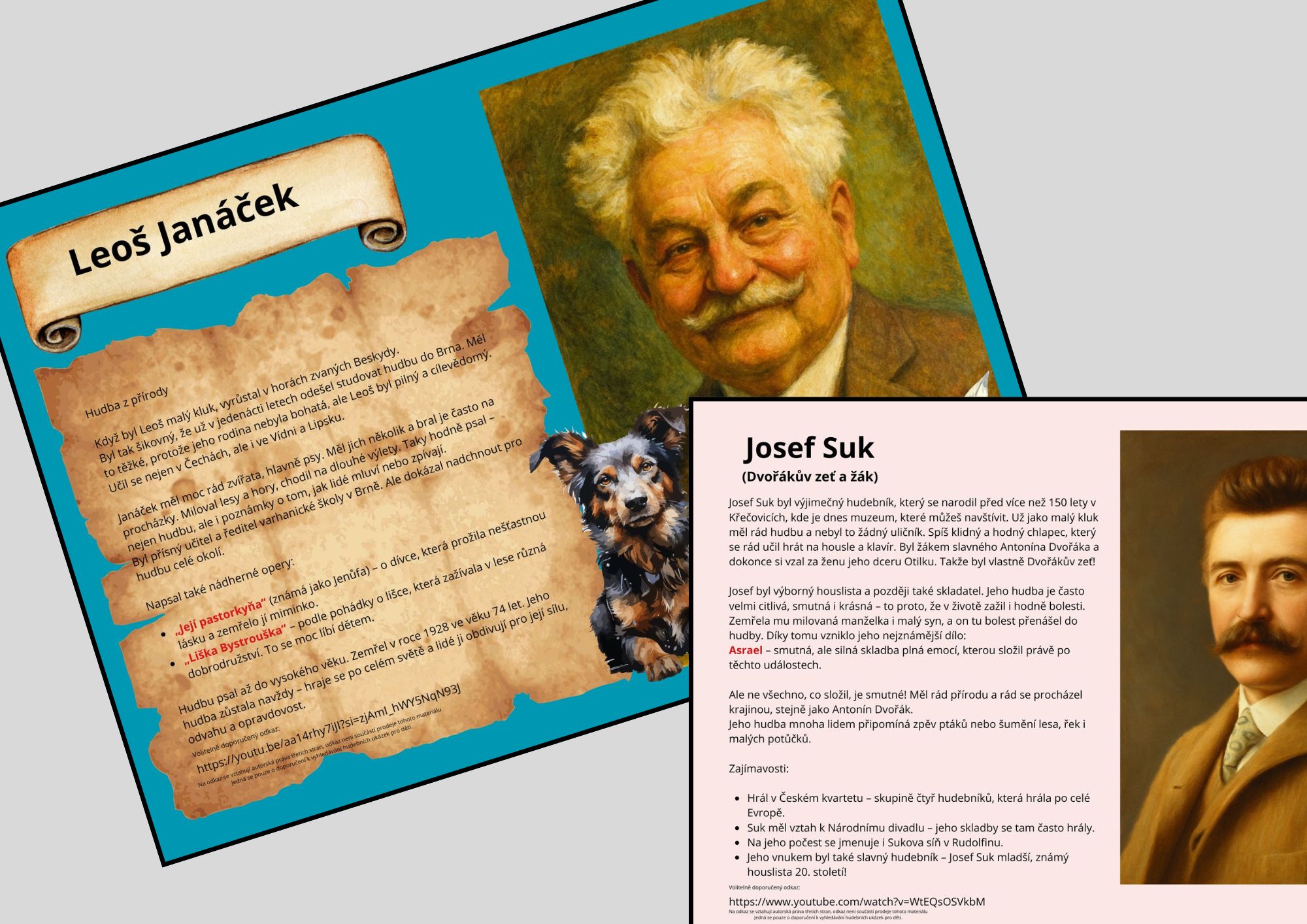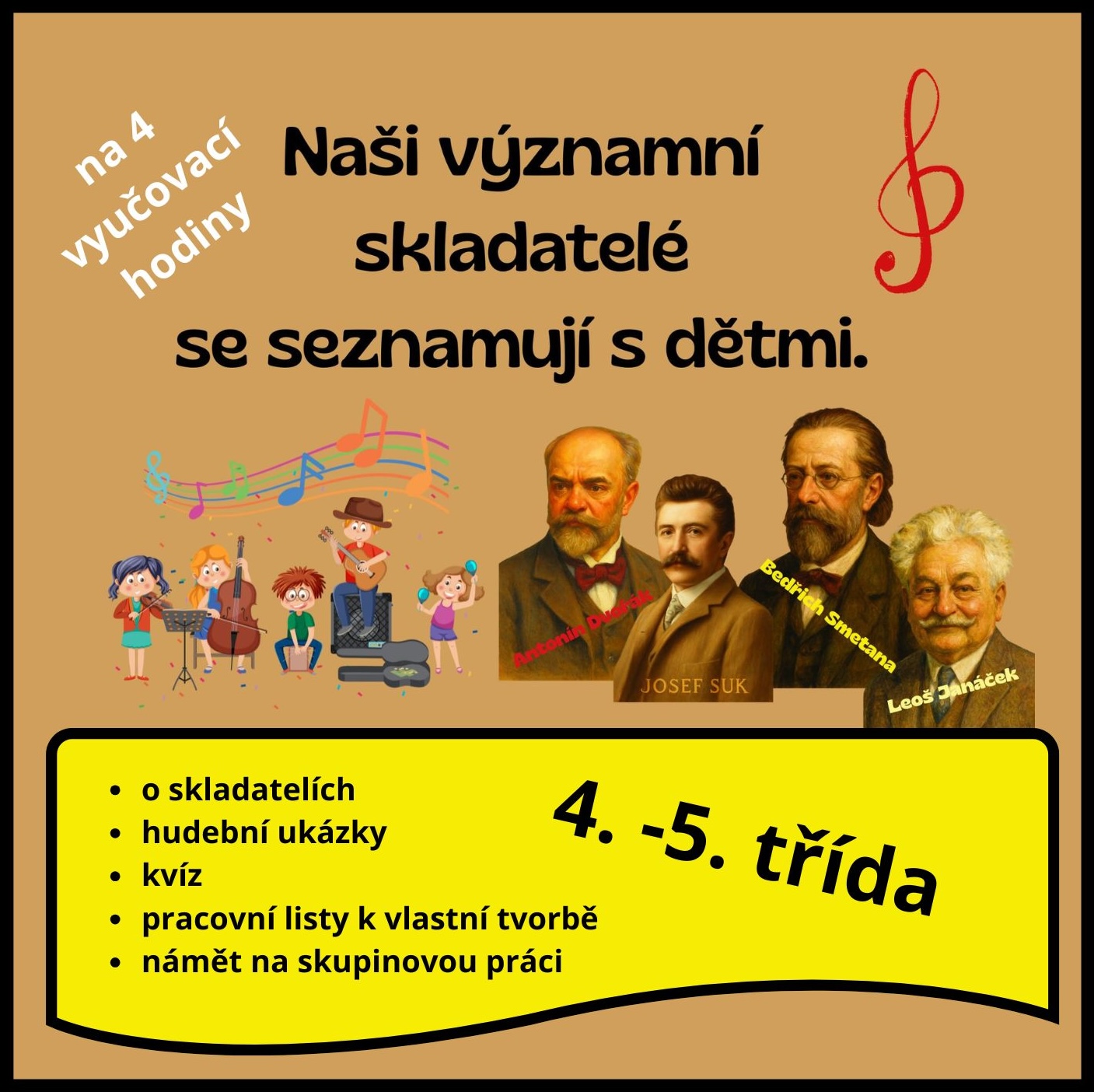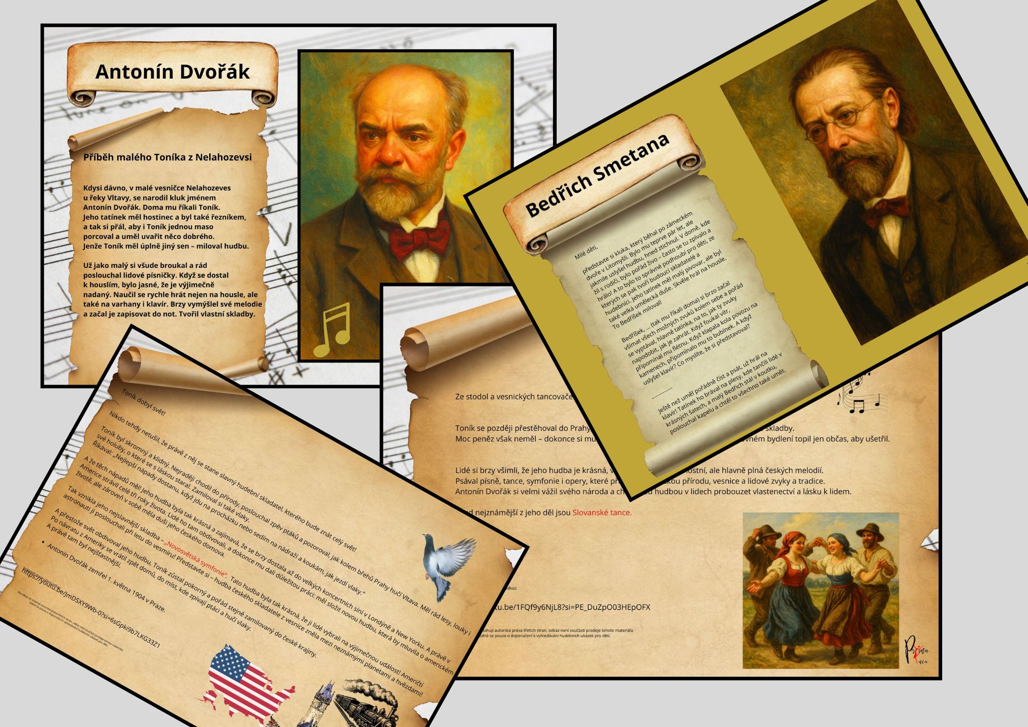 Tento materiál je vytvořený s cílem přiblížit dětem 1. stupně ZŠ české hudební skladatele – Antonína Dvořáka, Bedřicha Smetanu, Leoše Janáčka a Josefa Suka – srozumitelnou a poutavou formou, která rozvíjí vztah k hudbě, vlasti i české historii.
