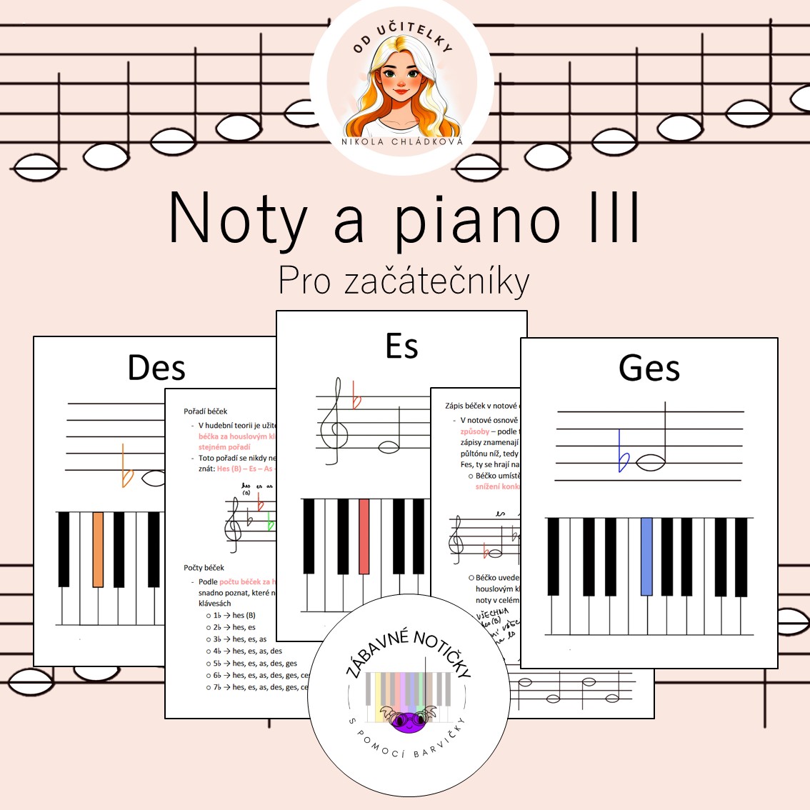 - 🎵dva způsoby notového zápisu a k němu odpovídající vyznačenou klávesu na pianu – obojí barevně sladěné, aby bylo hned jasné, která nota kam patří. (Hes/B, Es, As, Des, Ges, Ces, Fes)