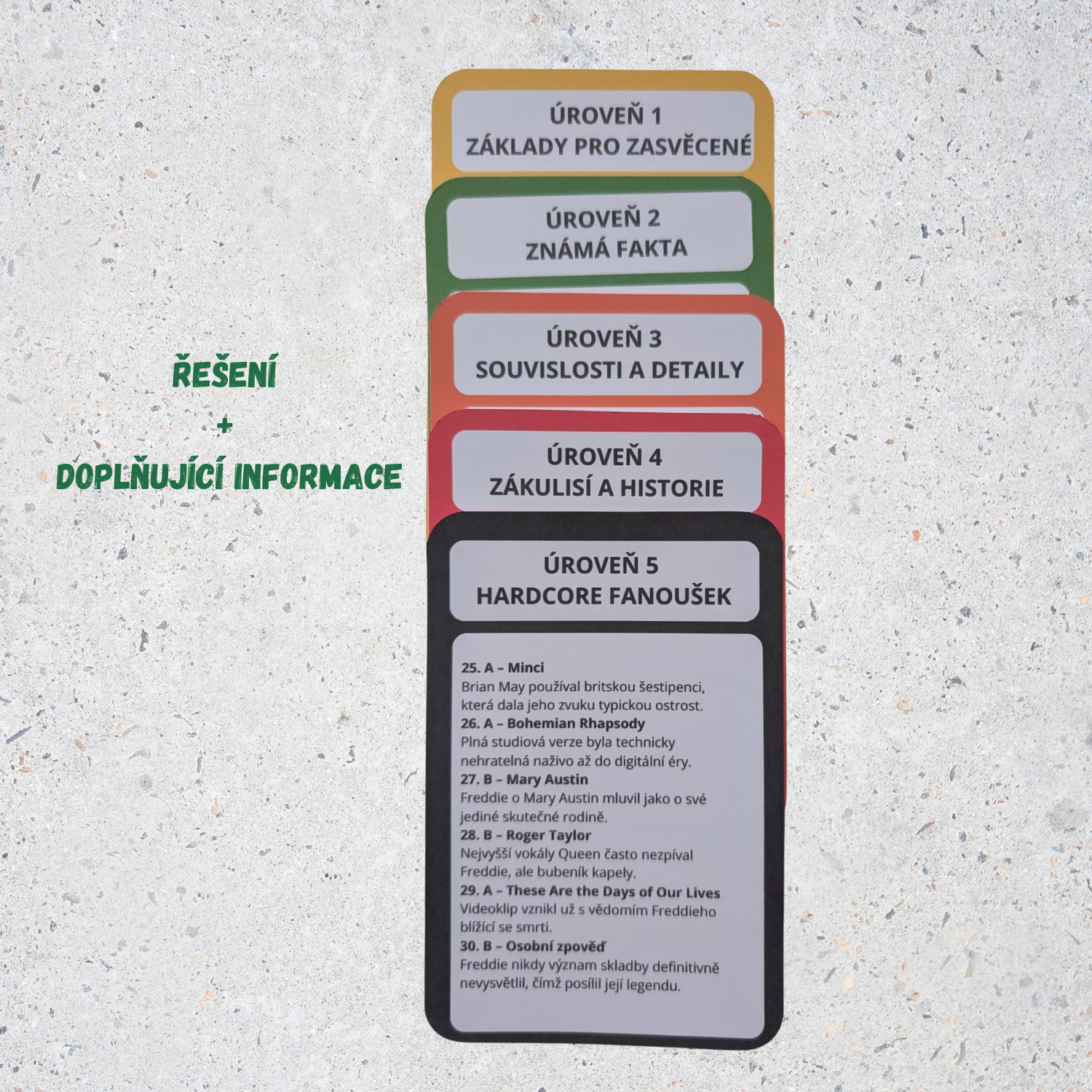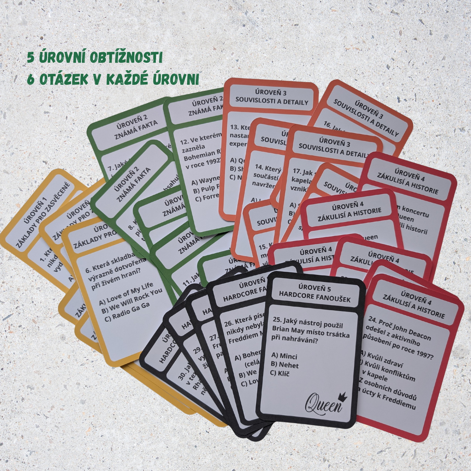 Materiál obsahuje kartičky rozdělené do pěti úrovní obtížnosti, přičemž každá úroveň zahrnuje šest otázek. Díky této struktuře lze hru snadno přizpůsobit věku, znalostem i tempu konkrétní třídy. Hra může probíhat se soutěžním bodováním, nebo pouze jako společná aktivita bez hodnocení.