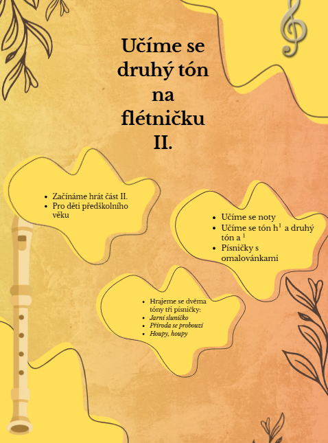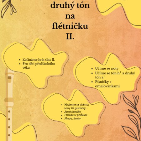 Soubor slouží jako metodický a praktický průvodce pro úplné začátky hry na zobcovou flétnu. Souvisle navazuje na předchozí první část, kde jsme se naučili první tón. Práce s materiálem počíná dechovou rozcvičkou a teoretickým i praktickým opakováním, které je velice důležité pro upevňování nových dovedností. Další část je zaměřena výuku dvou tónů a jejich střídání. V této části jsou dětem také vysvětleny první základy druhů not a jejich délek. Praktická část je zaměřena na písničky „Jarní sluníčko“, „Příroda se probouzí“ a „Houpy, houpy“, které jsou v notovém zápisu doplněny o názorné schéma hmatu a rytmickou nápovědu, což umožňuje dětem postupně upevňovat délku not, práci s dechem a rytmizaci textu.