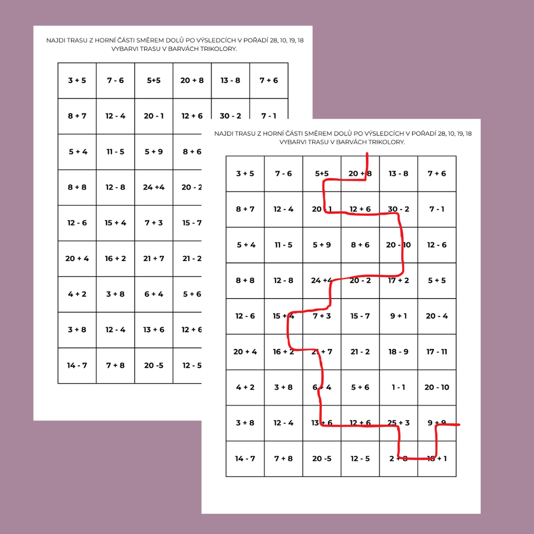 🧮 Matematika ke vzniku republiky – tři tabulky propojující počítání s významným datem 28. 10. 1918. Žáci hledají cesty po výsledcích a vybarvují trasu v barvách trikolory.