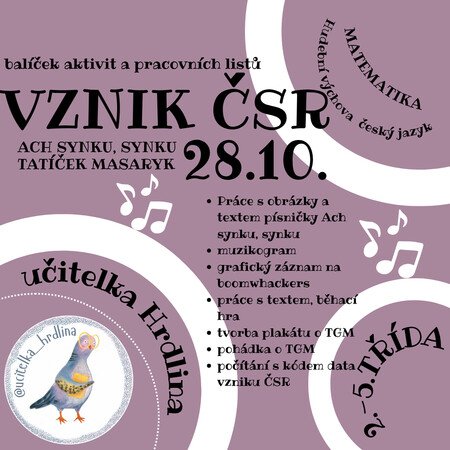 Probuďte s dětmi ducha 28. října! Tento komplexní balíček tří materiálů propojuje hudbu, čtení, tvoření i matematiku tak, aby si žáci první až třetí třídy zábavnou formou připomněli vznik Československa a osobnost T. G. Masaryka.