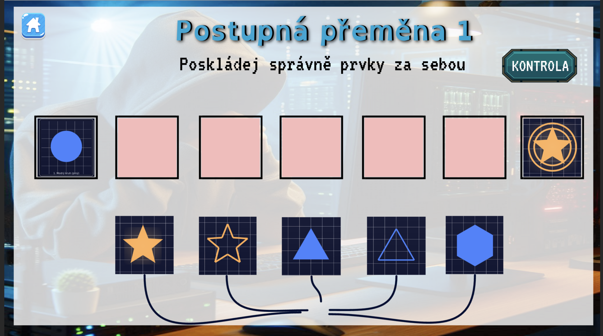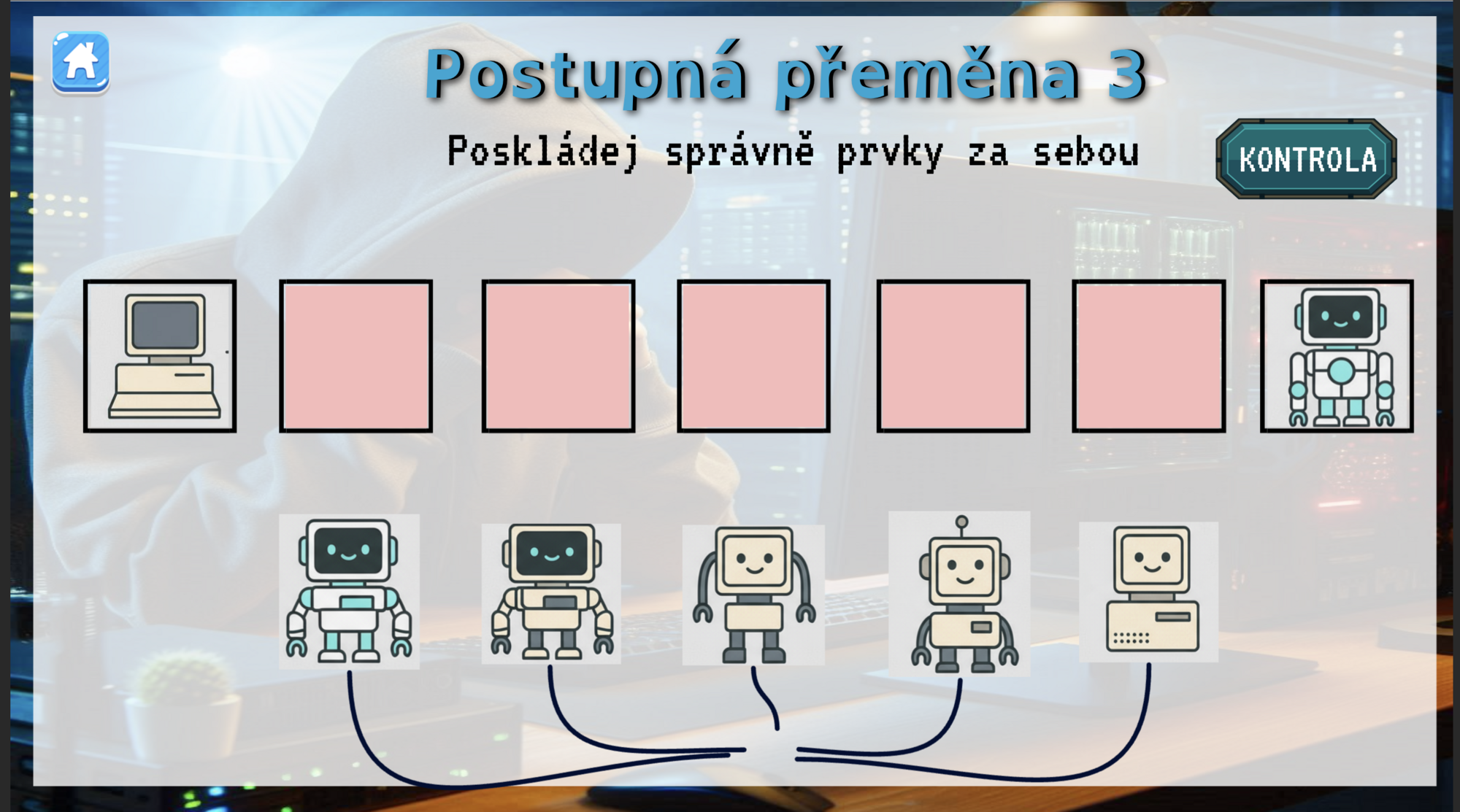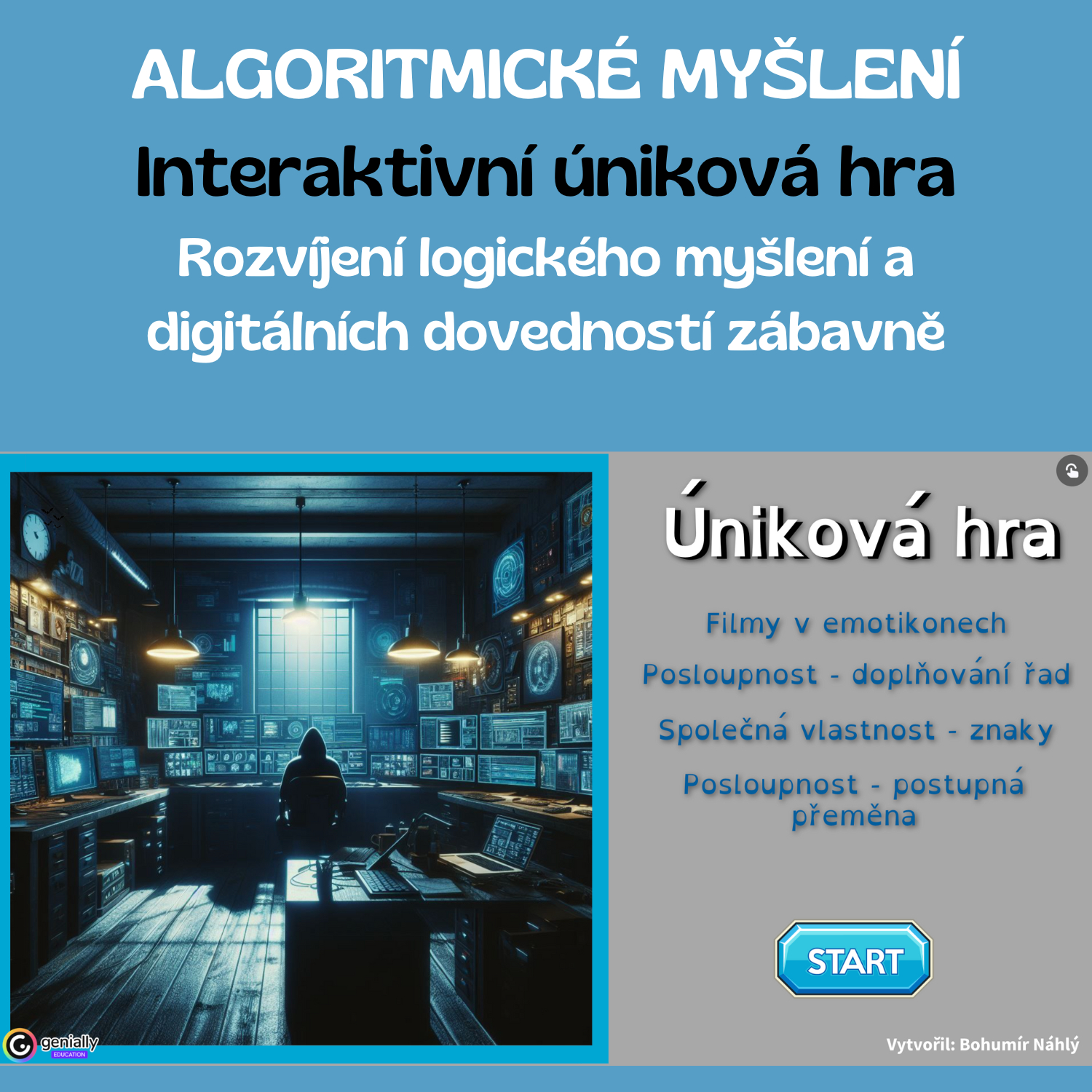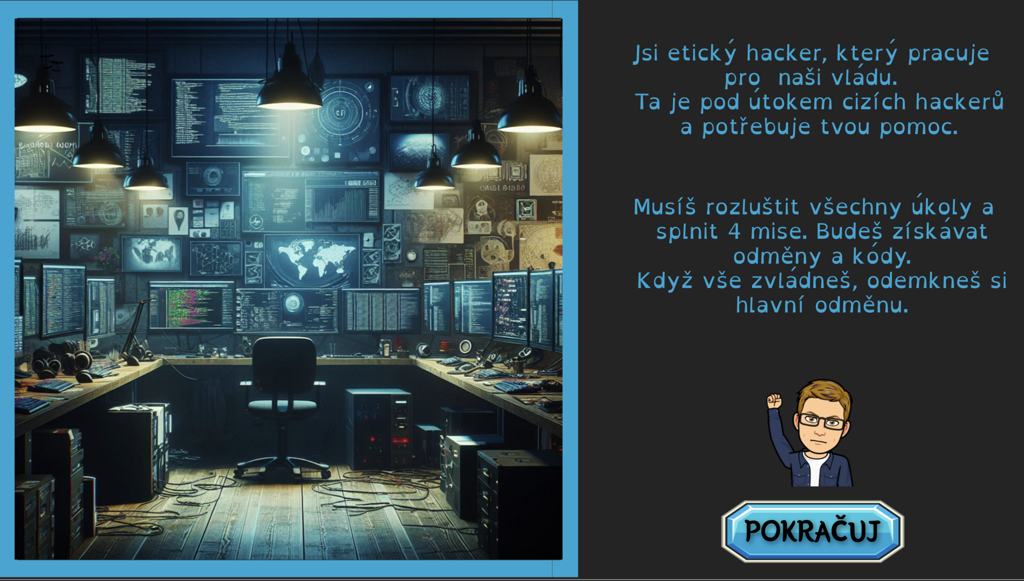 Děkuji, že jste se rozhodli pro nákup tohoto interaktivního materiálu, který je zaměřený na rozvoj algoritmického myšlení. Jedná se o typ únikové hry, ve které žáci musí postupně splnit 4 hlavní části obsahující celkem 10 interaktivních cvičení. Tematicky je hra zasazena do hackerského “doupěte”. Hráč představuje etického hackera pomáhajícího naší vládě. Na tu zaútočili cizí hackeři. Žák musí splnit všechny 4 mise, za každou splněnou získá část kódu a odměnu - část moderní PC sestavy. Hlavní odměna je potom celá PC sestava, ke které se dostane po odemčení závěrečného zámku. Doporučuji, abyste si hru sami nejdříve vyzkoušeli, než ji budete hrát s žáky.