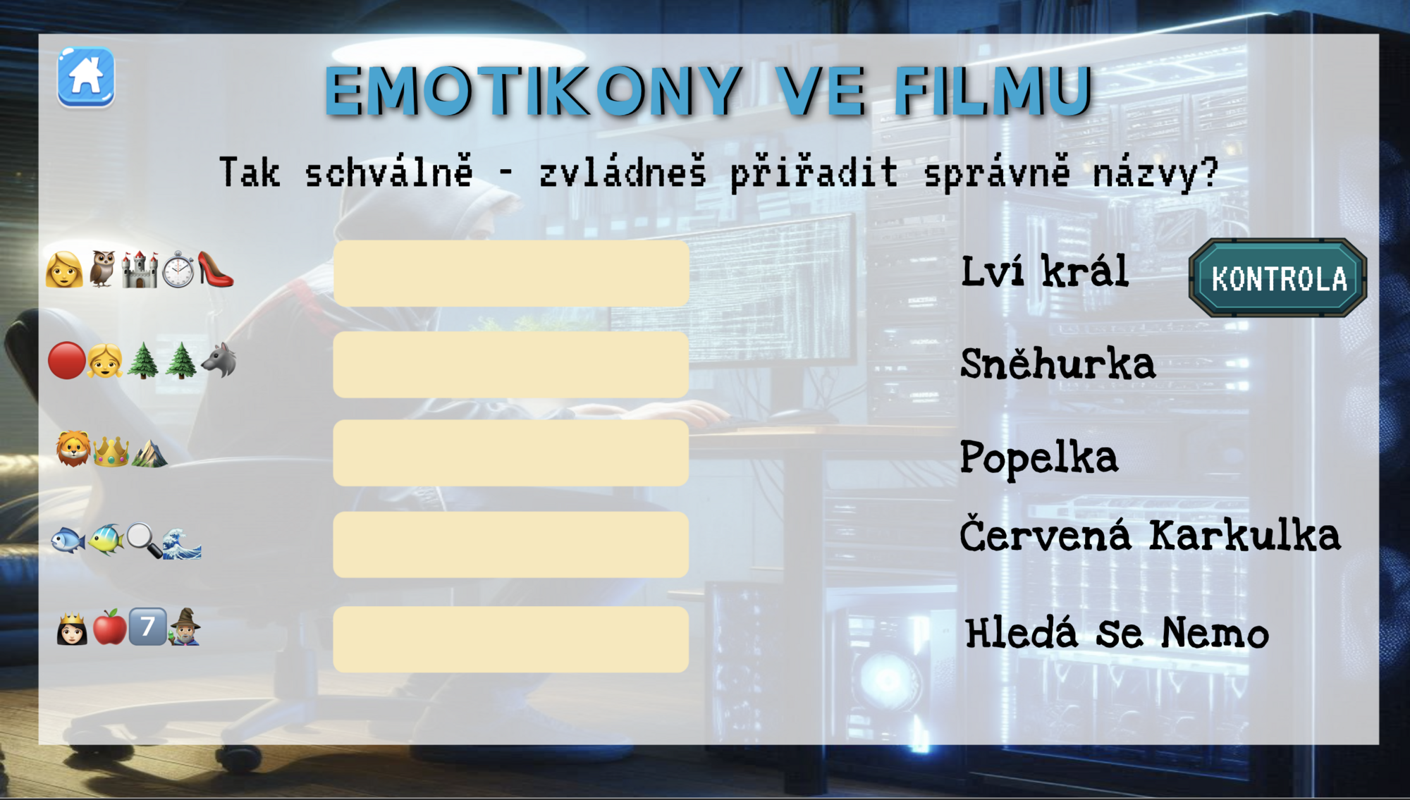 Na rozjezd musí žák rozluštit celkem 15 filmů zakódovaných do emotikonů. Po kliknutí na tlačítko KONTROLA se špatně umístěné výsledky vrátí na původní místo, jinak se objeví GIF s kódem a kliknutím na něj se posouvá žák dál.