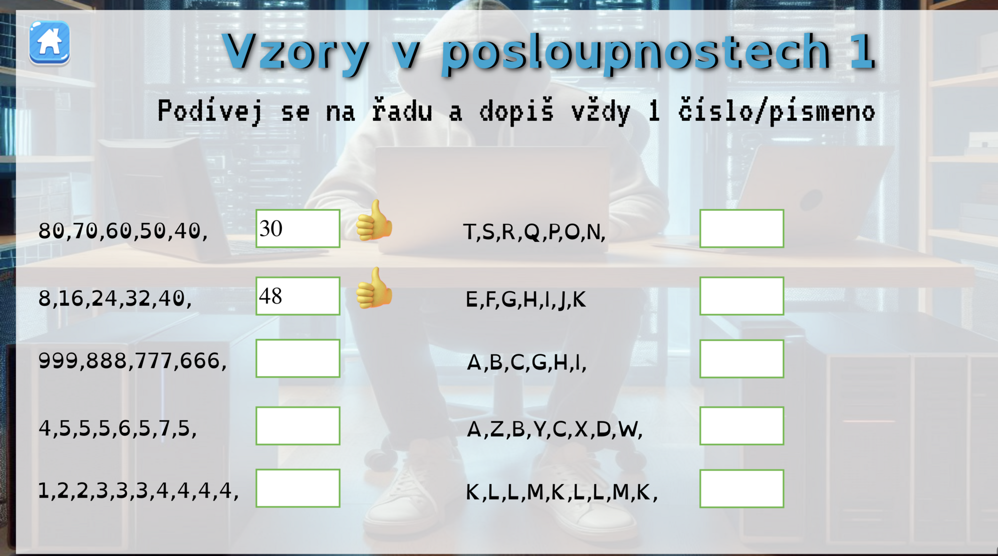 V prvním cvičení musí žák sám zapsat číslo nebo písmeno, které logicky následuje v dané řadě. Pokud napíše správný výsledek, objeví se malý palec nahoru. Ve druhém cvičení doplňuje na černý čtverec chybějící symbol z nabídky pod čarou. Po kliknutí na KONTROLA se při správném řešení musí objevit velký GIF s kódem. Pokud se neobjeví, řešení není správné.