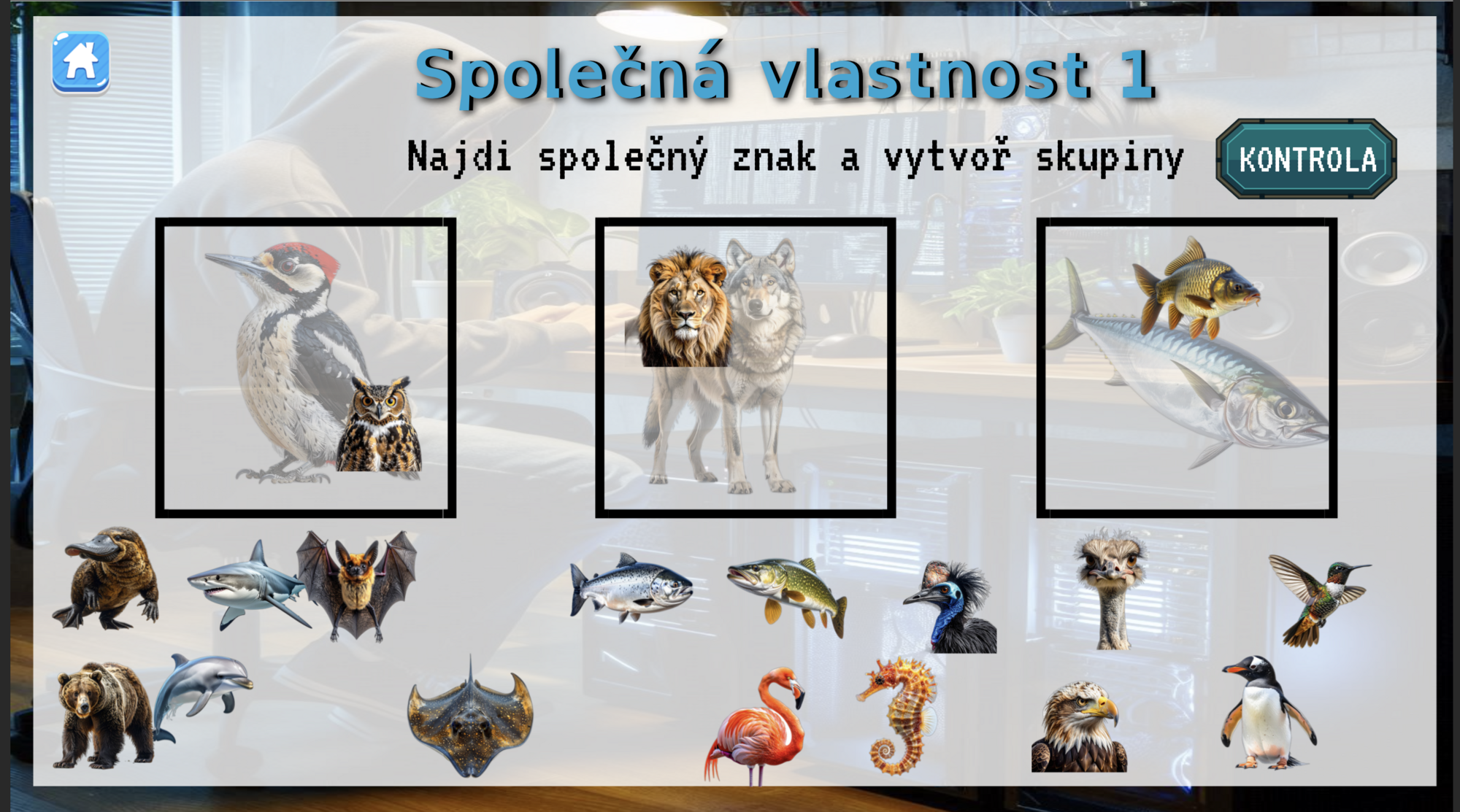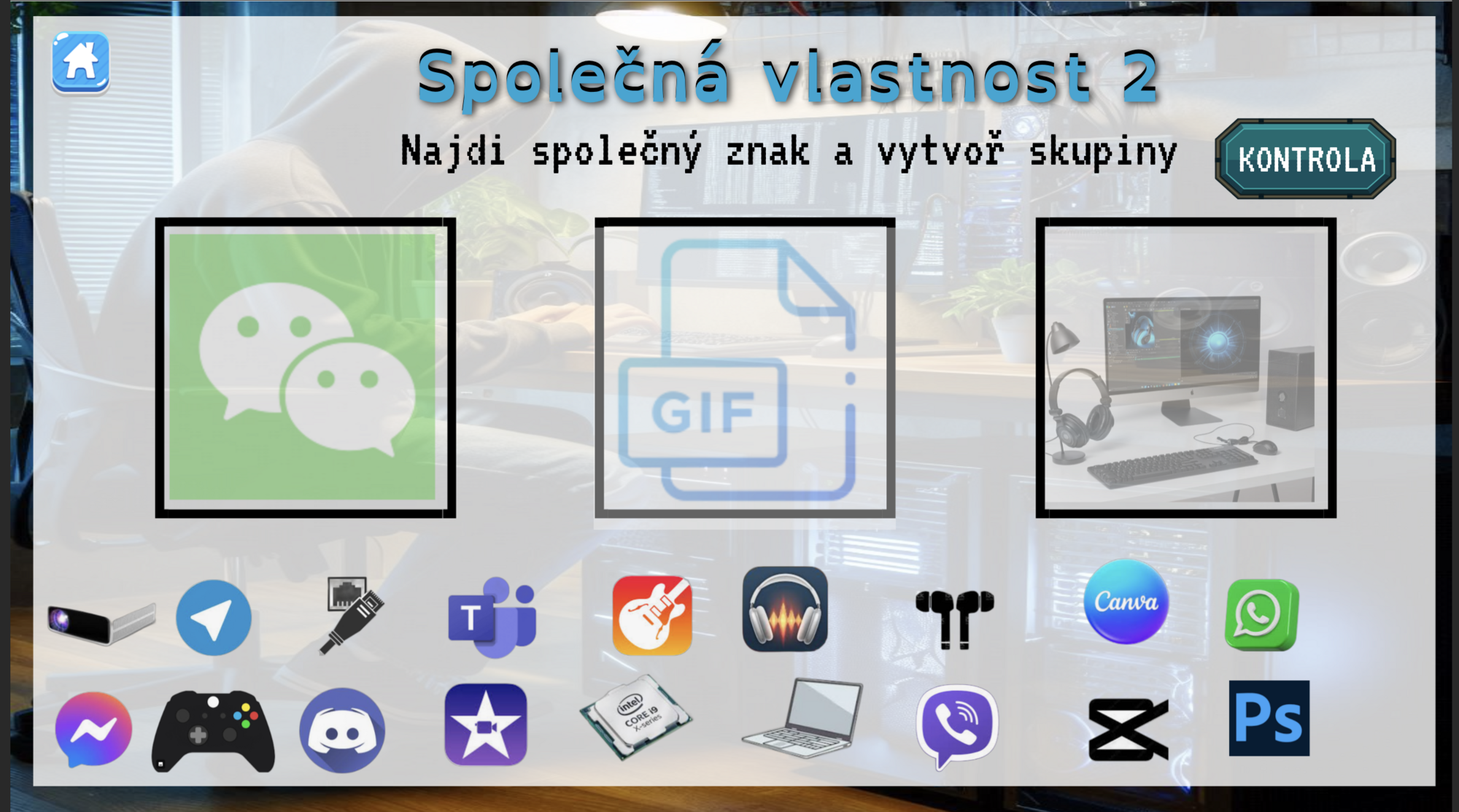 Úkolem je vydedukovat, co má skupina prvků/obrázků ve čtverci společného a objekty přetáhnout do správné skupiny. Po kliknutí na KONTROLA se při správném řešení musí objevit velký GIF s kódem. Pokud je řešení nesprávné, špatně umístěné prvky se vrátí na původní místo.