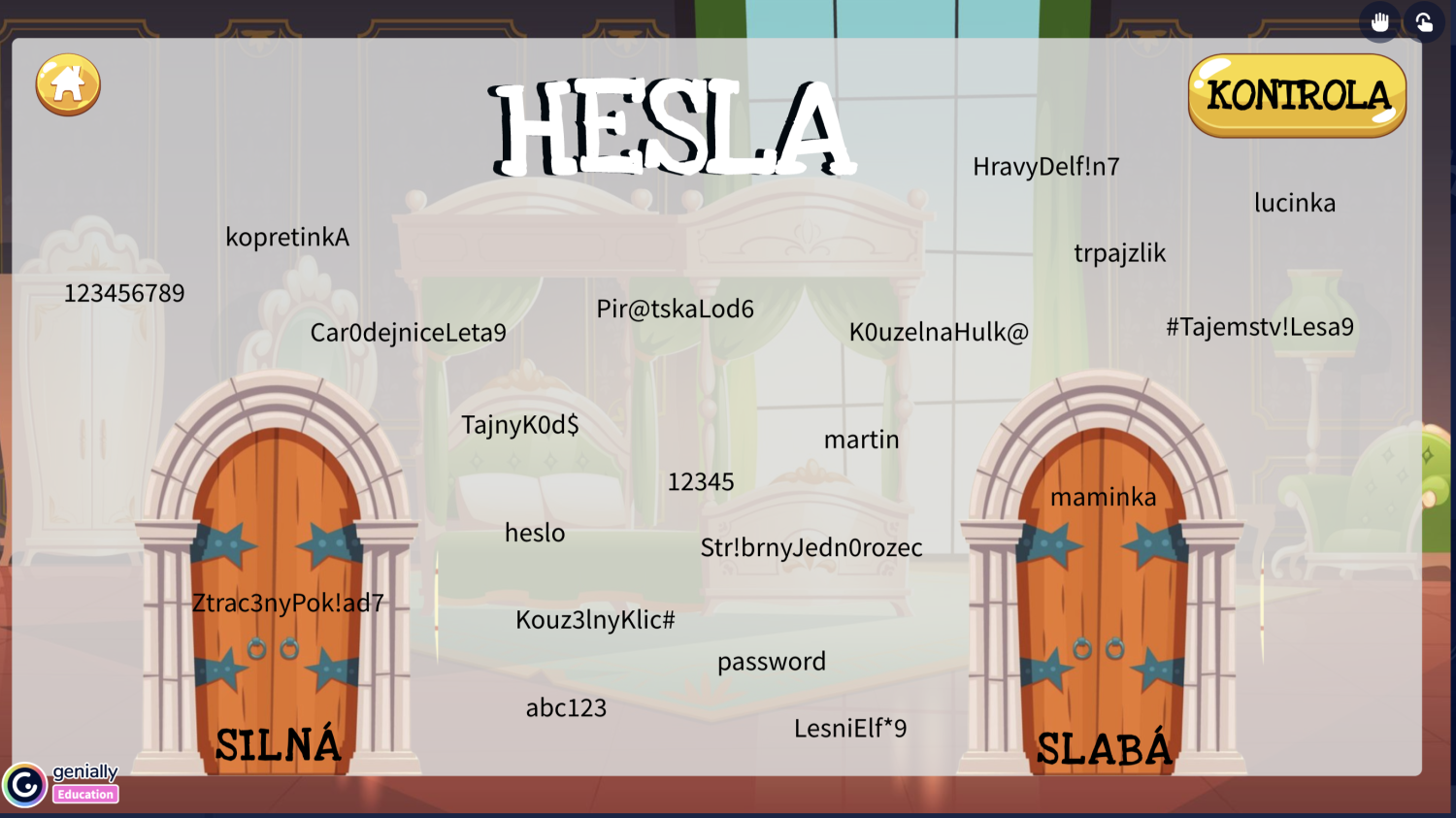 Místnost 1 Hesla - 4 cvičení - žák si ověřuje, jestli rozezná silná a slabá hesla.