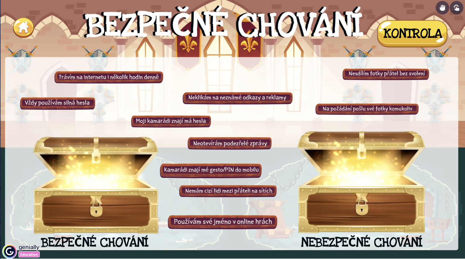 Místnost 2 Bezpečné chování - 2 cvičení - v obou cvičeních hráč rozlišuje co je bezpečné a nebezpečné chování na internetu, rozděluje do dvou skupin (přesunuje na truhly)