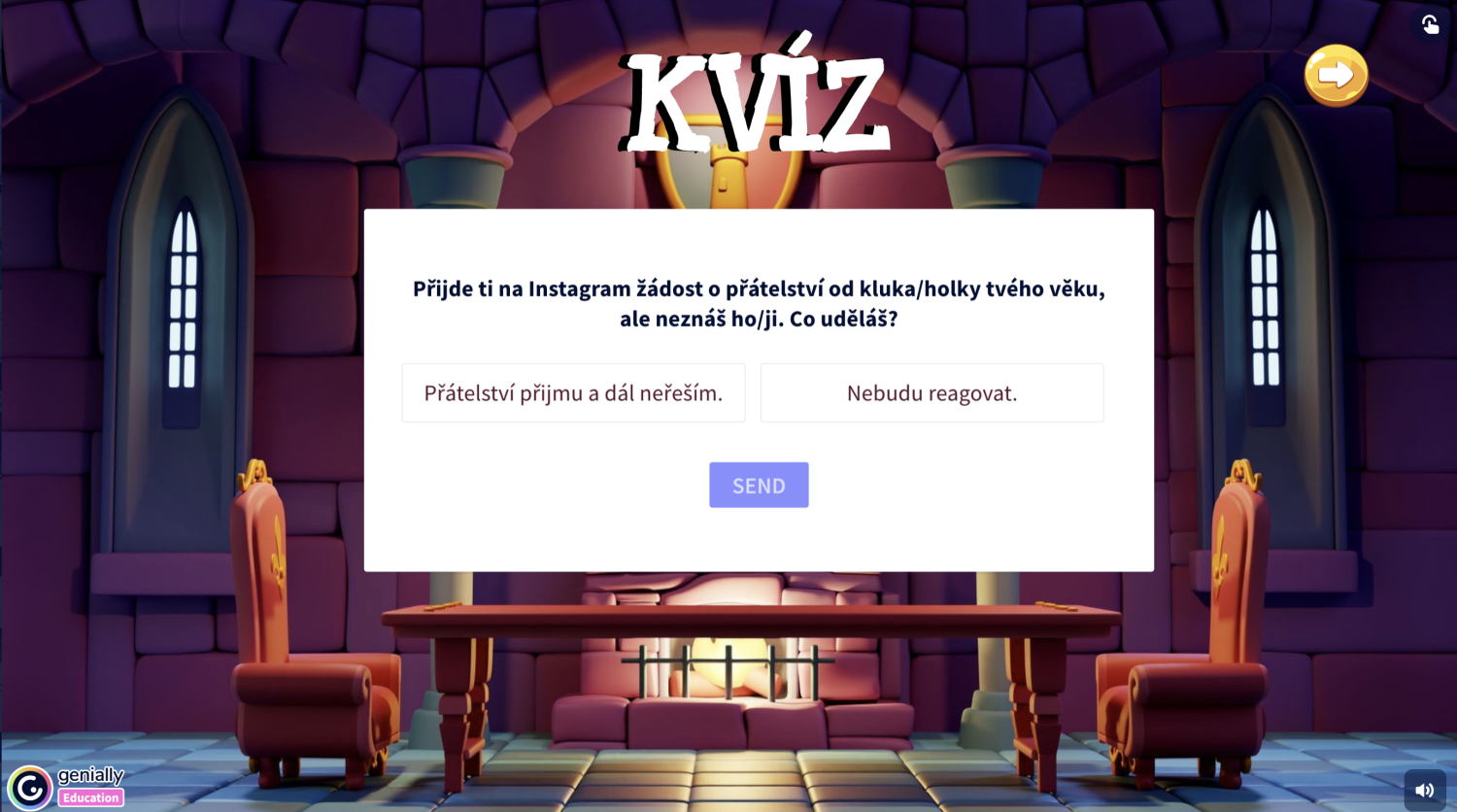 Místnost 3 Kvíz - obsahuje 15 praktických otázek/situací z prostředí chování na internetu a sítí, úkolem je vybrat správnou odpověď nebo správnou možnost, jak by měl hráč reagovat