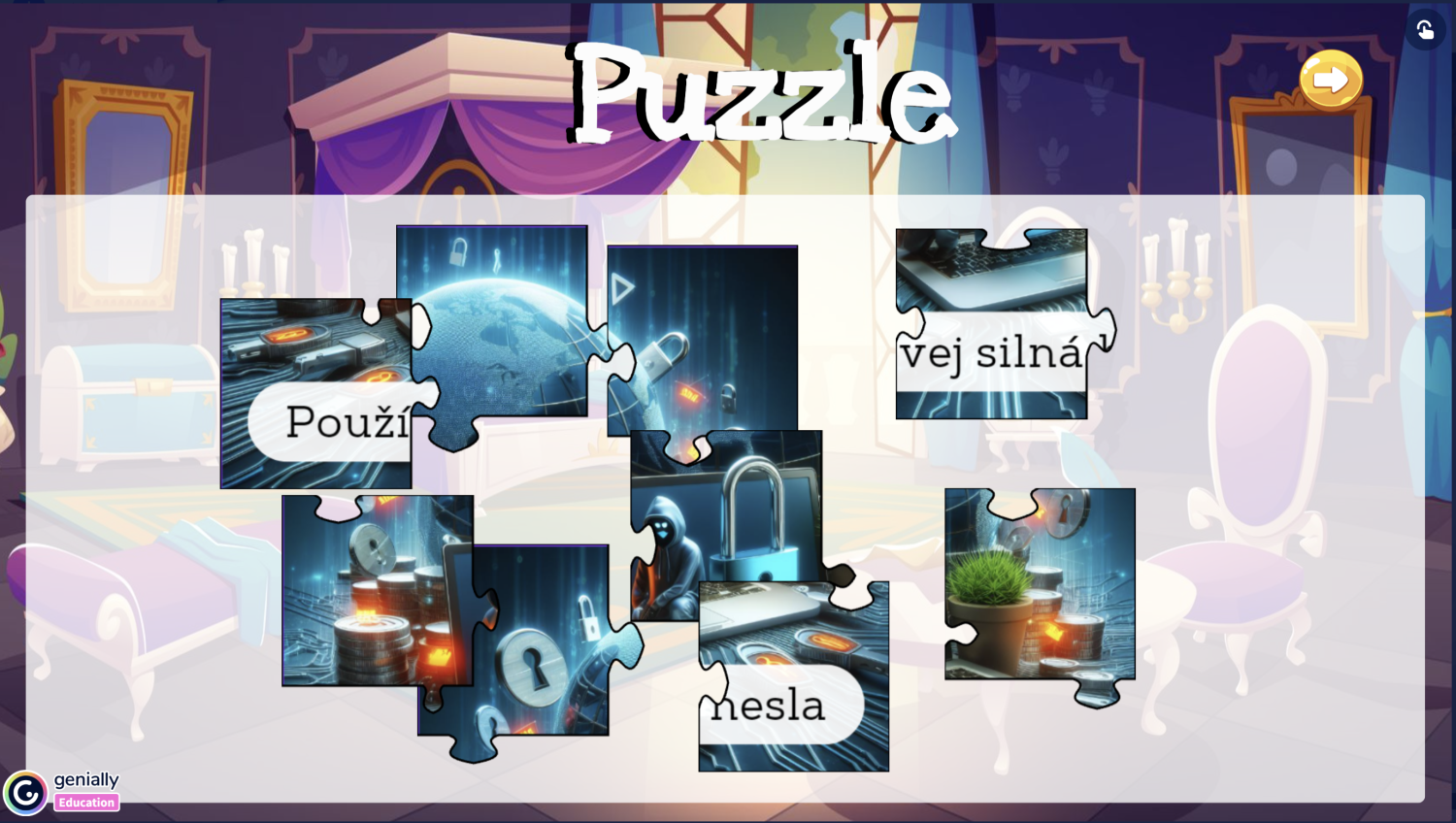 Místnost 4 Puzzle - 3 cvičení - úkolem je poskládat obrázek 3x3 s tematickou bezpečnosti; dílky do sebe pěkně zapadají, po poskládání se musí objevit GIF ruky se zvednutým palcem.