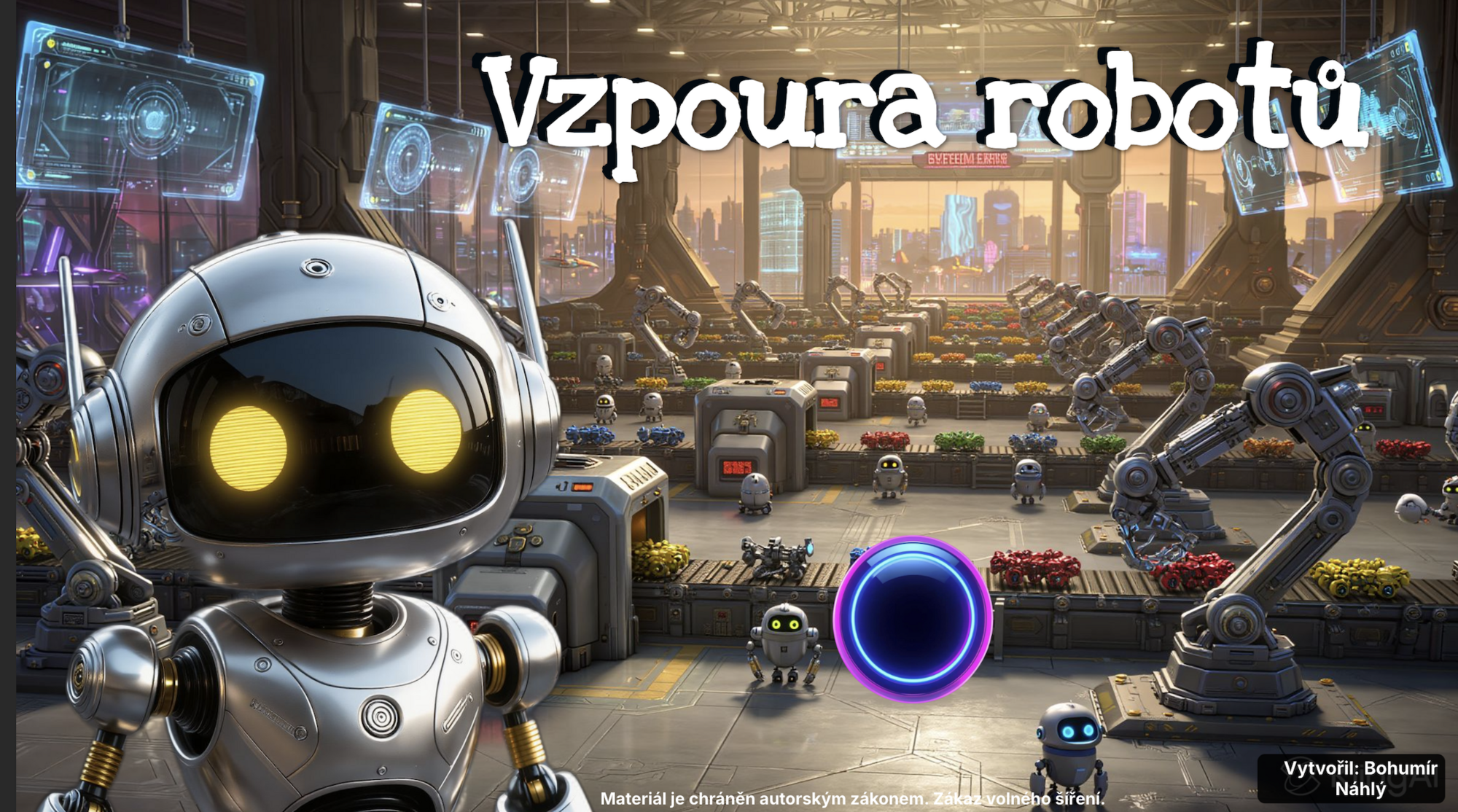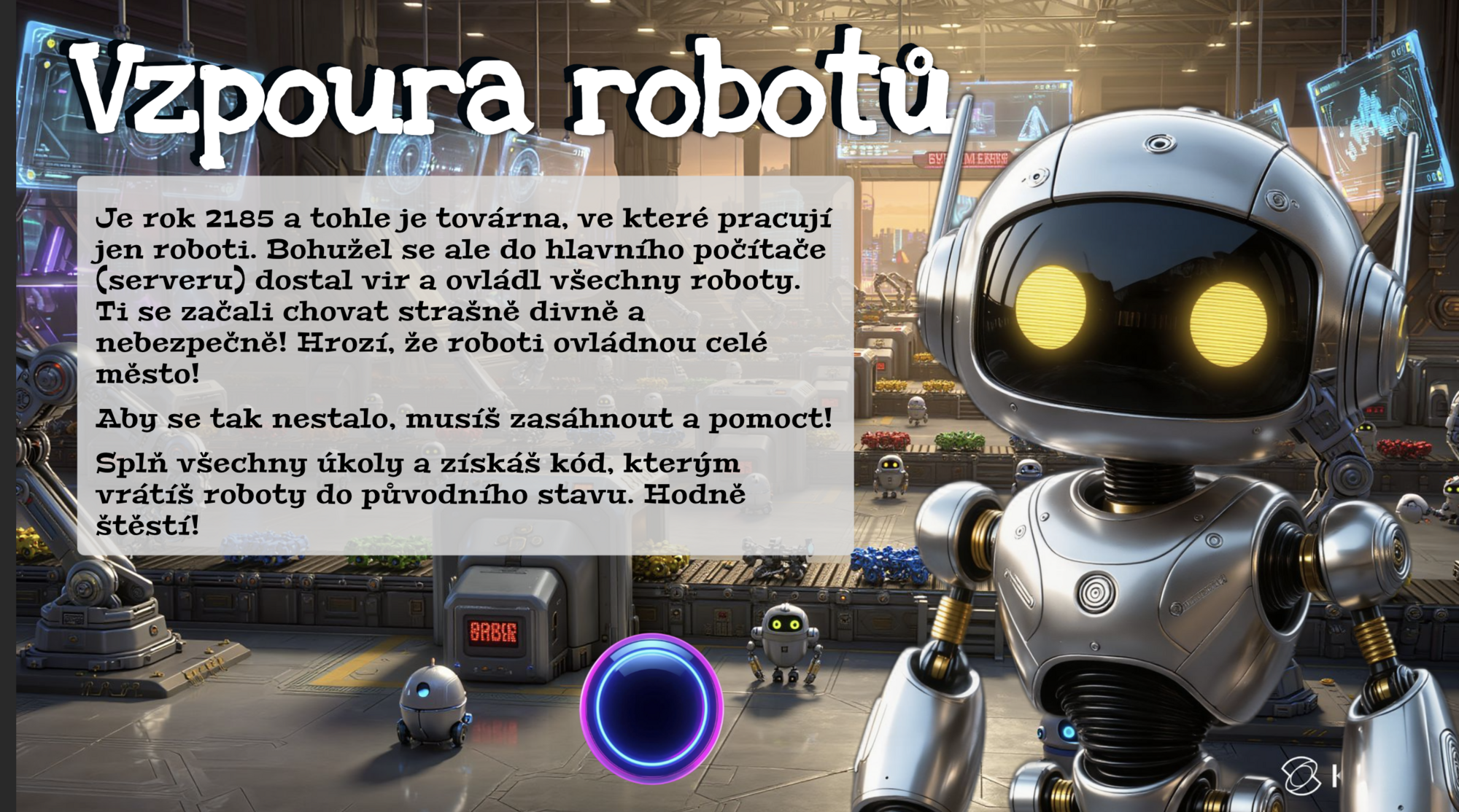 Zámek - po splnění 4. mise se žák dostane zpět na mapu s gratulací od robota; kliknutím na robota se dostane k zámku, zadá kód a dostává se na poslední obrazovku s gratulací.