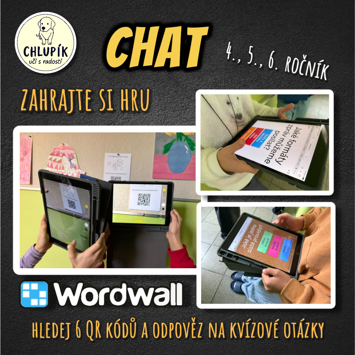 Poté po třídě rozmístíme 6 QR kódů. Každý vede na krátký kvíz k látce z listu (doporučuji zadávat jen křestní jméno/přezdívku/číslo). Děti postupně kódy skenují a vyplňují.