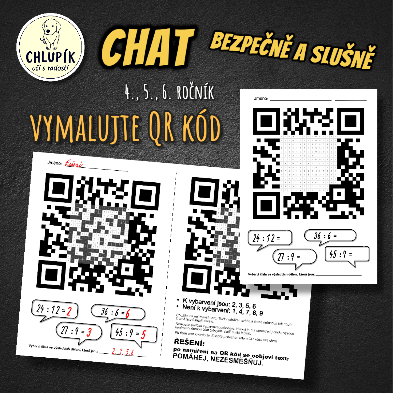 Na závěr děti vymalují závěrečný QR kód podle pokynů. Po správném domalování a naskenování se zobrazí tajenka: „POMÁHEJ, NEZESMĚŠŇUJ.“
