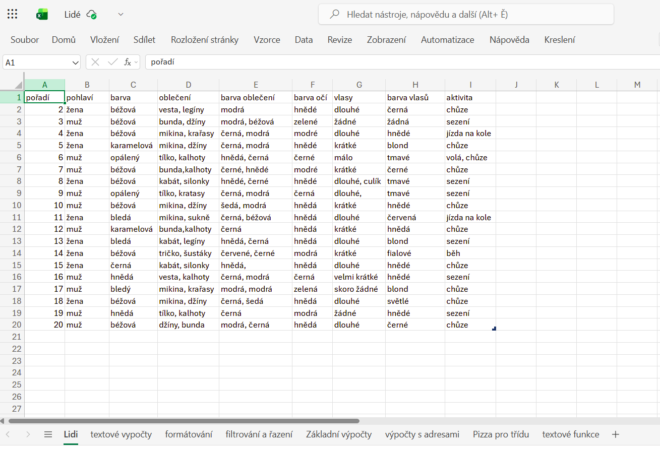 Každý žák vytvoří Excelový sešit s několika listy. Na jednotlivých listech si vyzkouší různé postupy v programu a prokáže pochopení daného tématu.