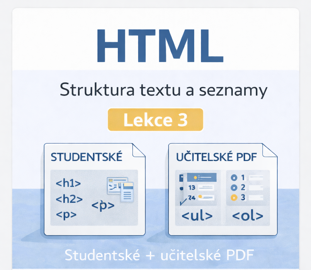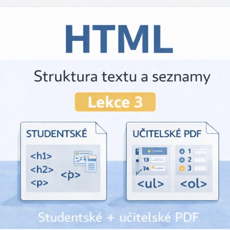 Materiál HTML – struktura textu a seznamy (Lekce 3) je určen pro začátečníky v HTML a navazuje na předchozí lekce zaměřené na strukturu dokumentu a práci s atributy.