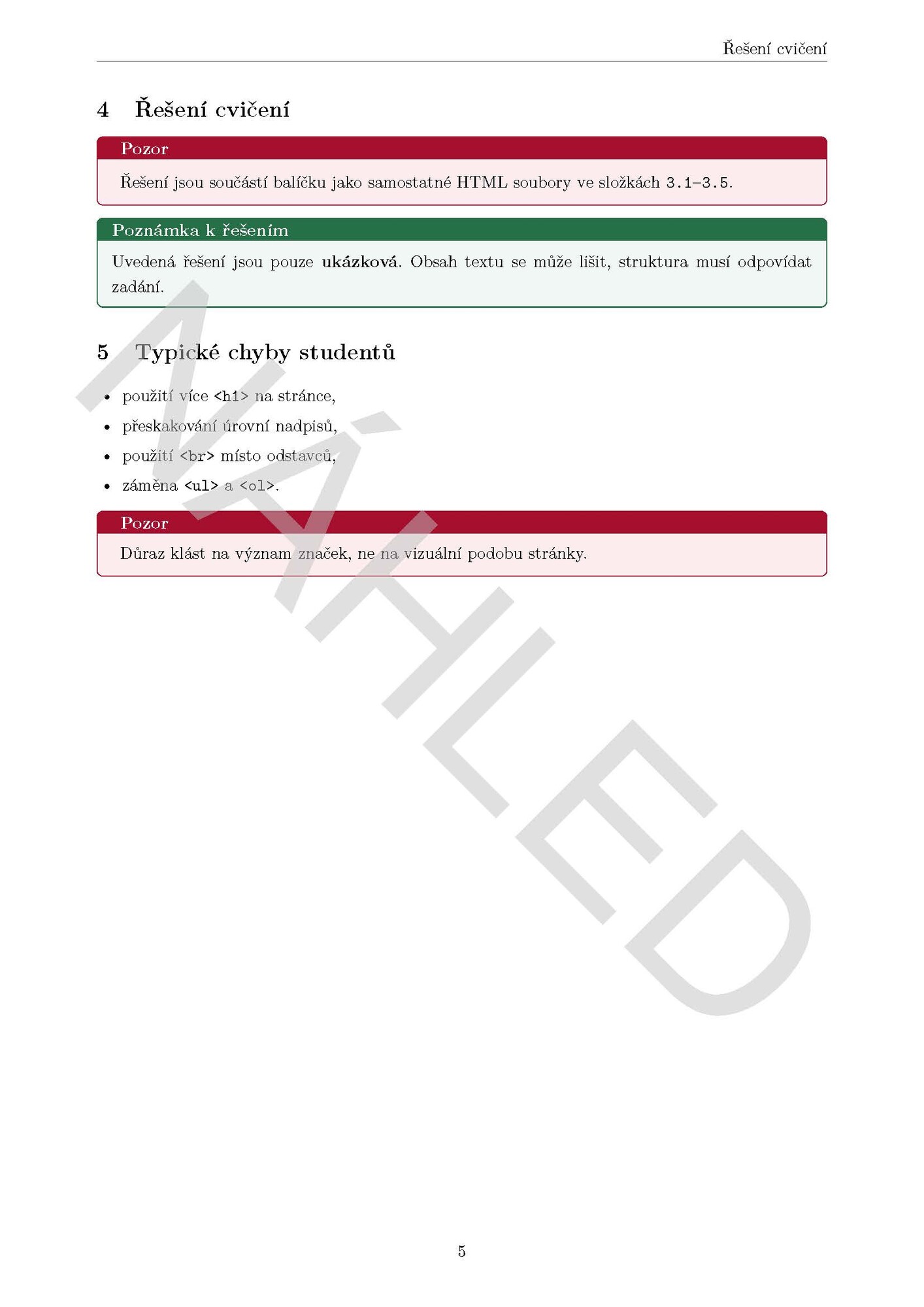 - HTML řešení cvičení ve formě samostatných souborů (každé cvičení zvlášť).