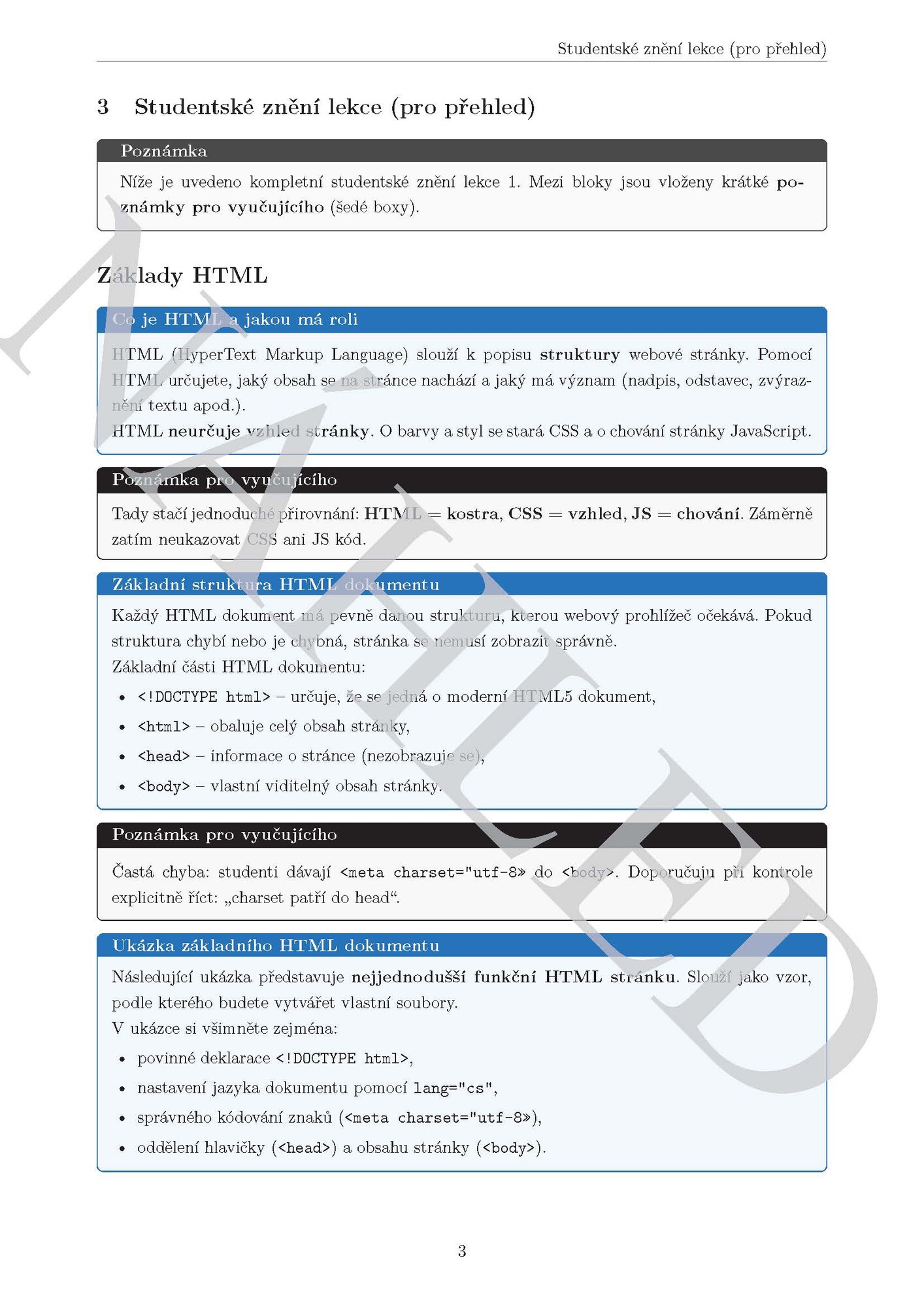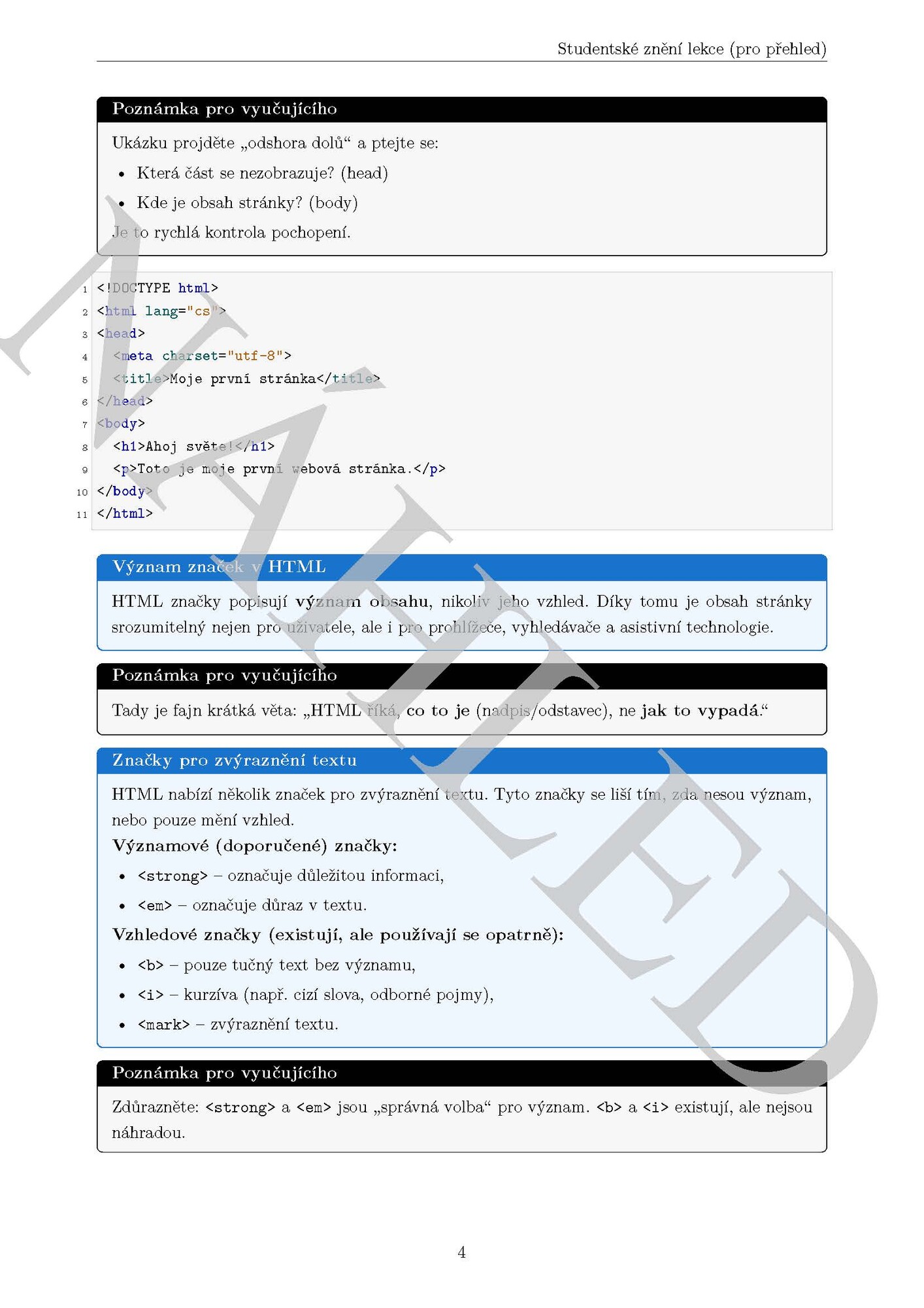 Studijní materiál krok za krokem vede studenta k vytvoření své první webové stránky, ukazuje správnou strukturu HTML dokumentu, používání významových značek (<strong>, <em>) i zápis speciálních znaků (HTML entity).