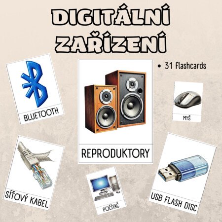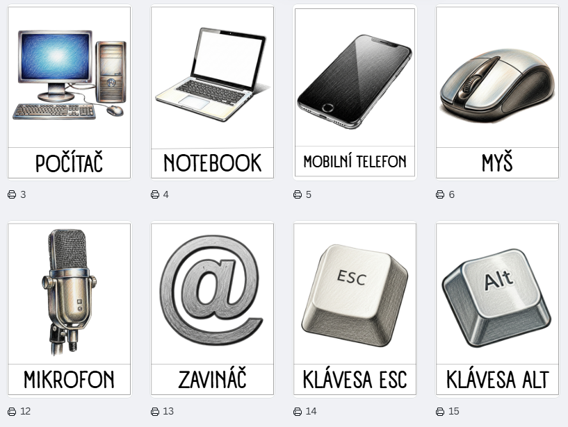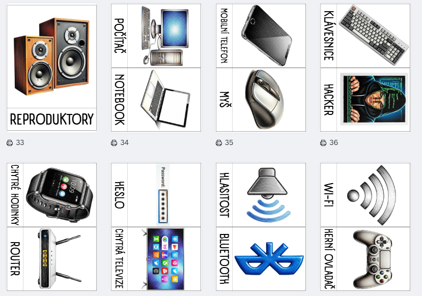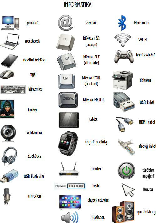 - 31 flashcards na téma informatika (počítač, notebook, mobilní telefon, myš, klávesnice, hacker, webkamera, sluchátka, USB flash disc, mikrofon, zavináč, klávesa ESC, klávesa ALT, klávesa CTRL, klávesa ENTER, tablet, chytré hodinky, router, heslo, chytrá televize, hlasitost, Bluetooth, WI-FI, herní ovladač, tiskárna, USB kabel, HDMI kabel, síťový kabel, tlačítko napájení, kurzor, reproduktory)