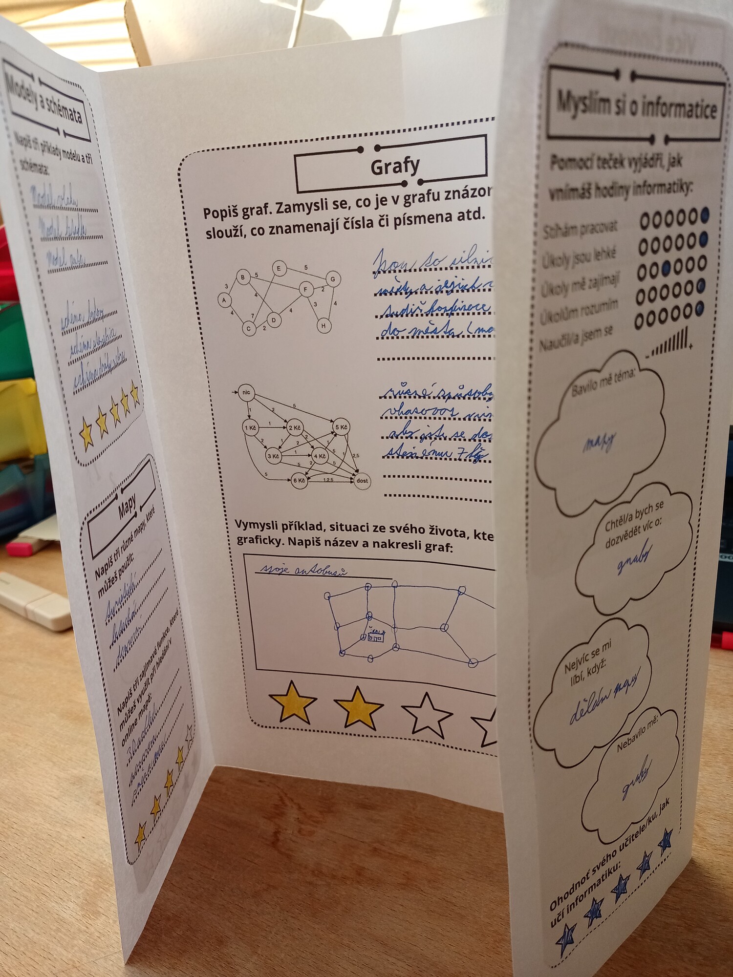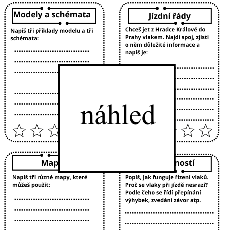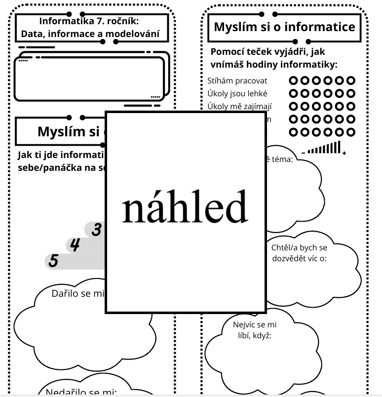 Materiál slouží k vytvoření lapbooku, který bude shrnovat poznatky žáků z tematického celku Data, informace a modelování. Vychází z kapitol učebnice Základy informatiky pro 2. st. ZŠ volně dostupné na portálu iMyšlení. Shrnuje kapitoly Běžně užívané modely, Ohodnocení a orientované grafy a Paralelní činnosti.