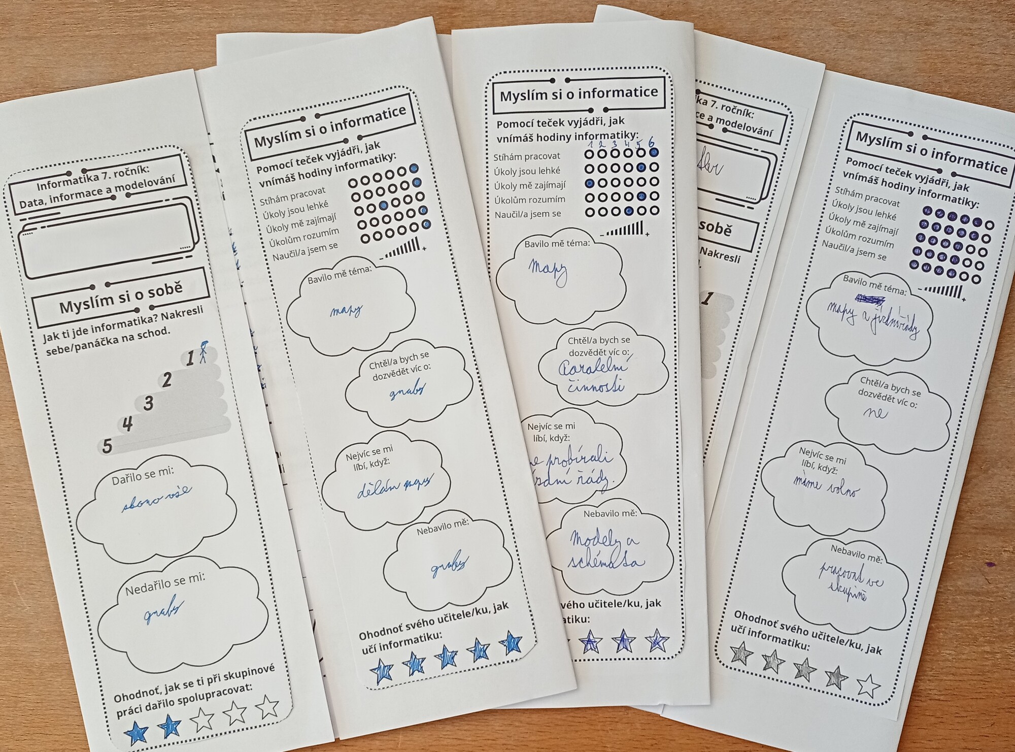 Výsledná práce slouží i jako nástroj hodnocení a sebehodnocení. Žáci mohou pomocí hvězdiček vyjádřit svůj názor na jednotlivé úlohy a poté zhodnotit výuku informatiky jako předmětu a svoje dovednosti v probírané oblasti.