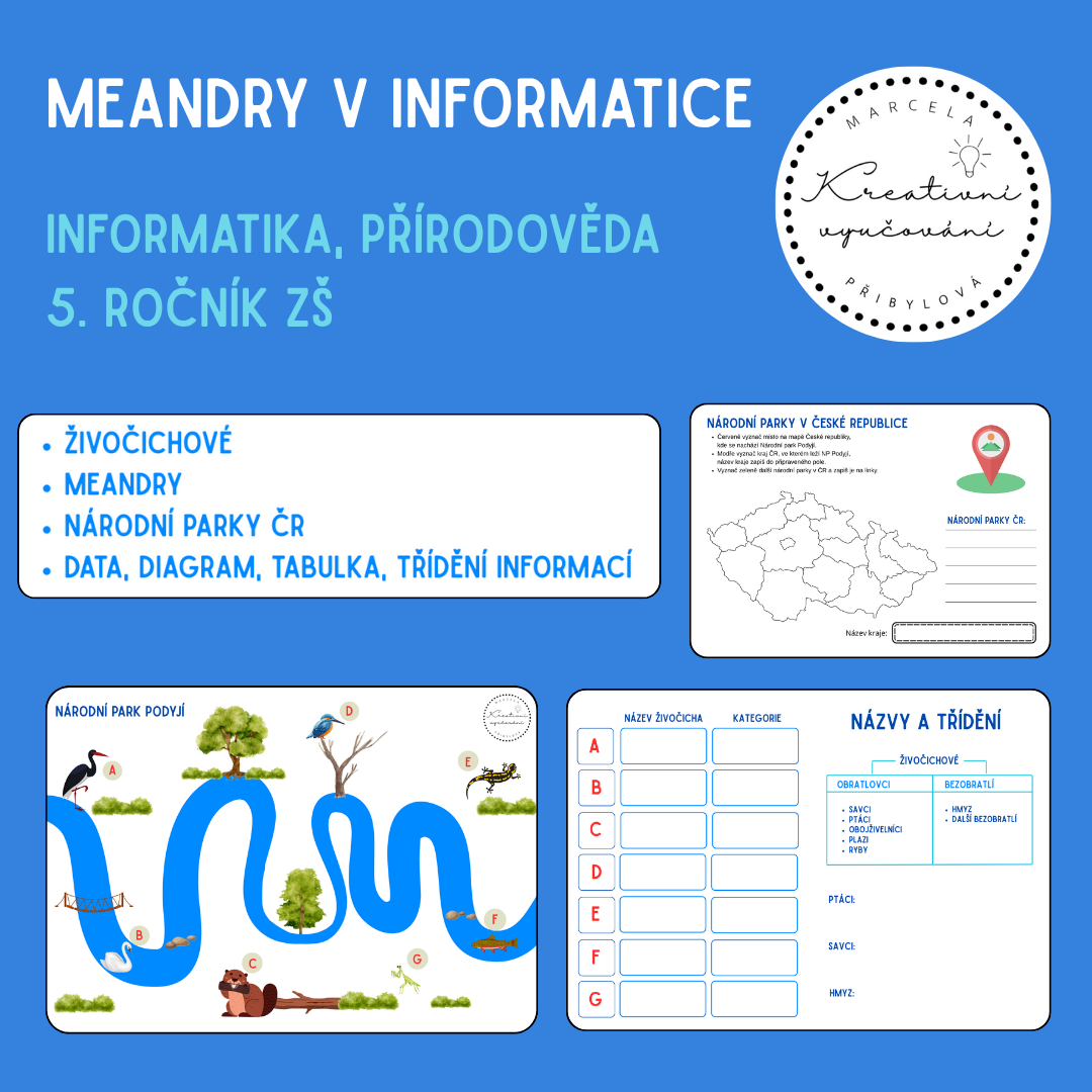 Materiál je doporučen do výuky informatiky a přírodovědy v 5. ročníku ZŠ, buď odděleně (lze vybrat pouze vhodný list a materiál jen pro daný předmět, např. diagram a třídění do výuky informatiky) nebo lze propojit tyto dva předměty v jeden delší výukový blok. Žáci se seznámí s geografickými a přírodními charakteristikami národního parku, poznají jejich typické živočichy, seznámí se s pojmem meandr a se základním tříděním živočichů. Pojmenují další národní parky v ČR a orientují se na mapě ČR. Rozvinou schopnosti práce s tabulkami, diagramy, daty a informacemi a ověří informace na internetu. Materiál obsahuje pracovní listy a řešení pracovních listů. Vyberte vhodný list pro Vaše žáky a vytiskněte nebo lze soubor promítnout na tabuli ve třídě.