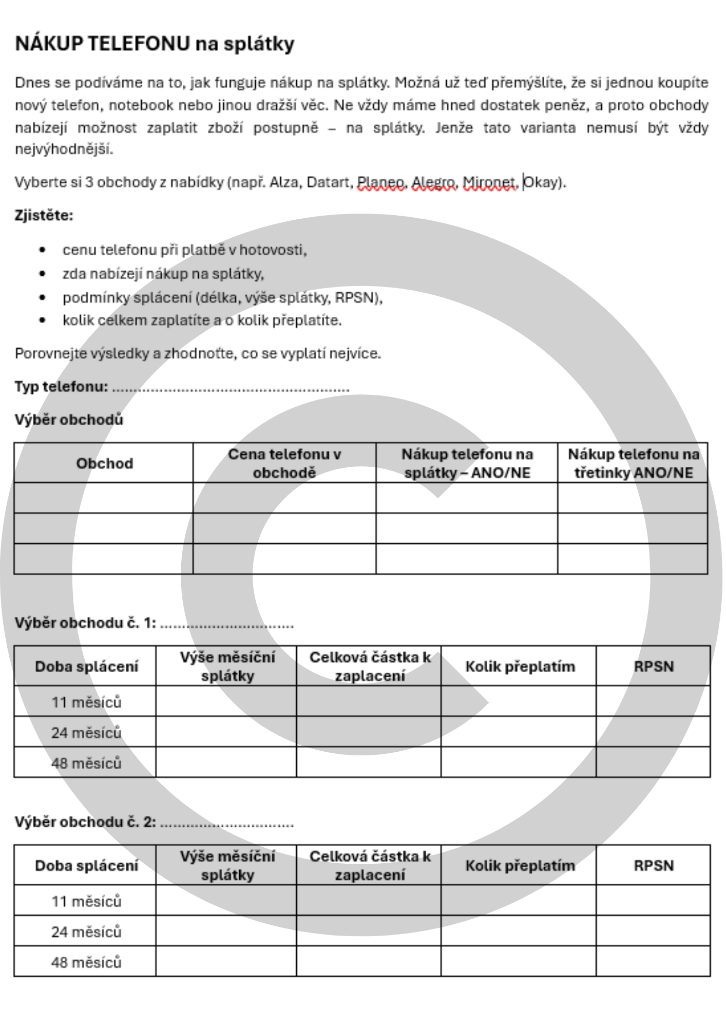 Žáci budou porovnávat podmínky nákupu, výši měsíčních splátek, celkovou částku k zaplacení, RPSN i výši přeplatku. Aktivita směřuje k diskuzi o výhodnosti jednotlivých variant a k přemýšlení o zodpovědném hospodaření s penězi.