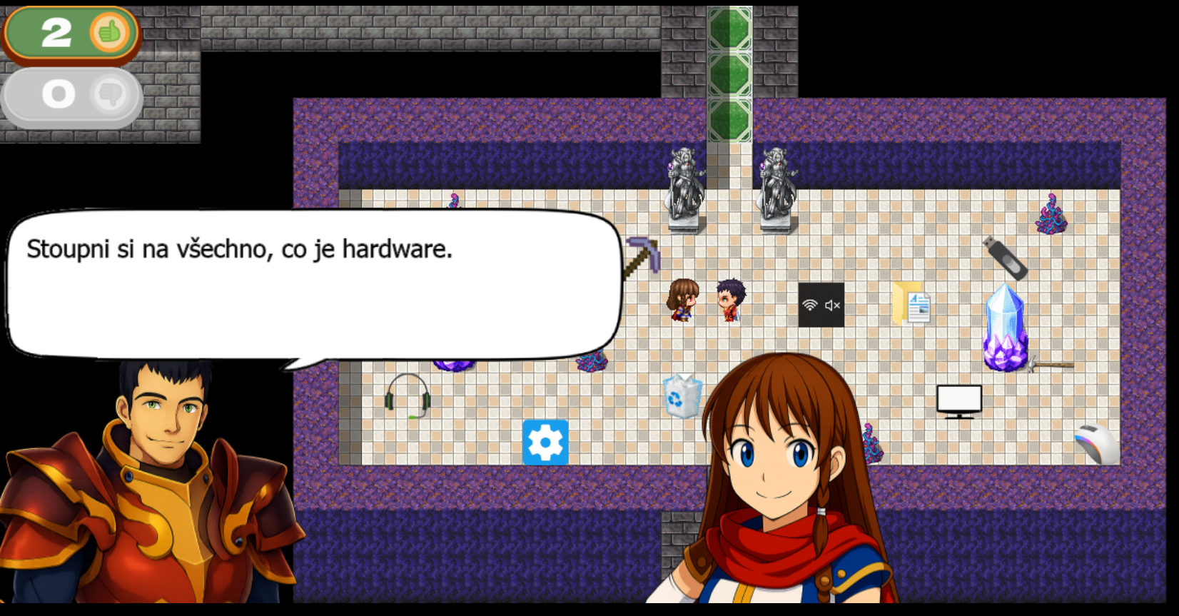 Materiál je určen pro žáky ZŠ, kteří umí číst a klikat myší :) Žáci hrají za postavu (kluk nebo holka), která začíná v podzemí, prochází jím, plní úkoly a získává body. Takže klasická úniková hra.