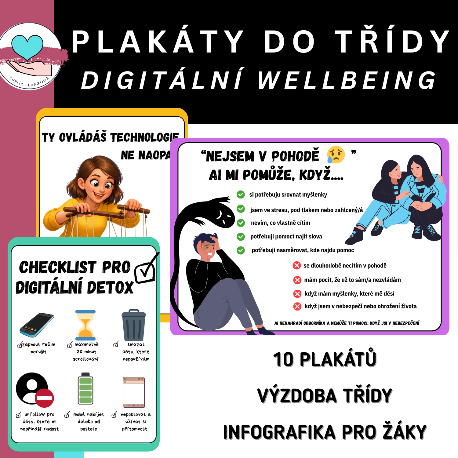 Sada 10 barevných, srozumitelných a motivačních plakátů k digitálnímu wellbeingu, které žákům pomáhají přemýšlet o používání technologií s větším nadhledem.