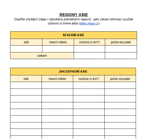 Cílem materiálu je žáky seznámit nejen s regionálním členěním Asie, ale i porovnat mezi sebou jednotlivé regiony a státy z hlediska rozlohy a počtu obyvatel. V tomto materiálu jsou navíc i cvičení, ve kterých se pak formou diskuse s žáky dostáváme k tomu, jak s daty pracovat, odkud je čerpat atd.