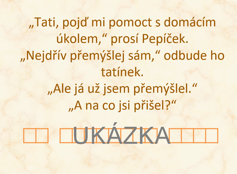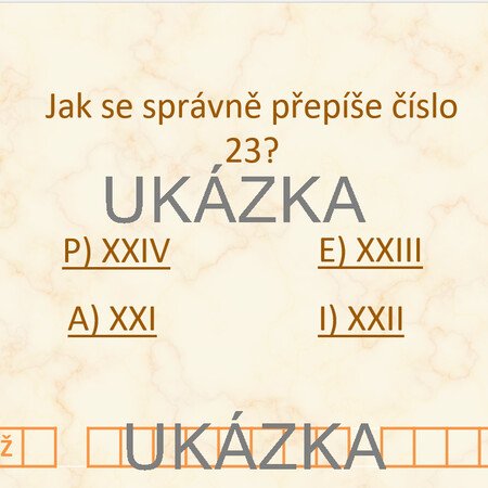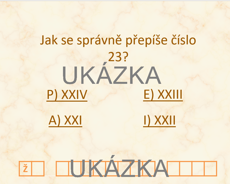 Tento materiál je určen k interaktivní práci s celou třídou. Základem aktivity je prezentace promítaná na plátno, ve které žáci řeší 14 příkladů formou hádanky. U jednotlivých úloh se žáci společně domlouvají na správné odpovědi. Po kliknutí na zvolenou možnost se zobrazí, zda je odpověď správná nebo nesprávná. Při správné odpovědi žáci získají písmenko do tajenky, při chybě se k otázce vracejí a chybu si musí opravit.
