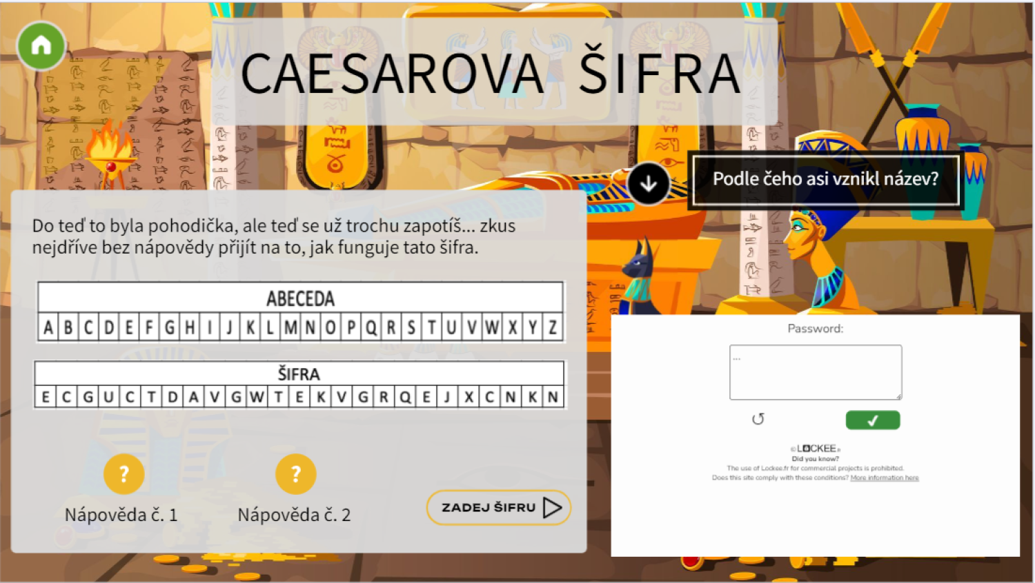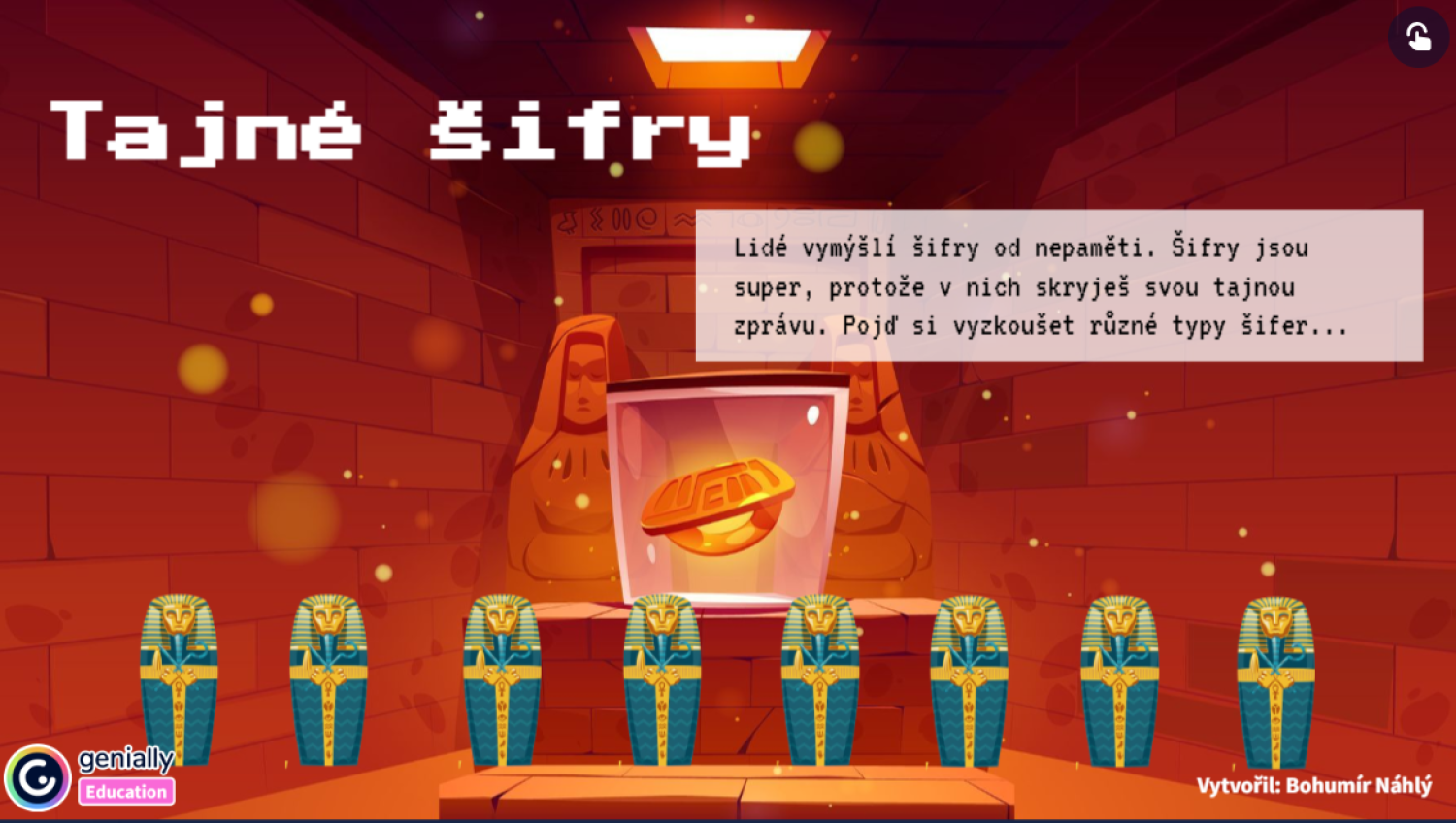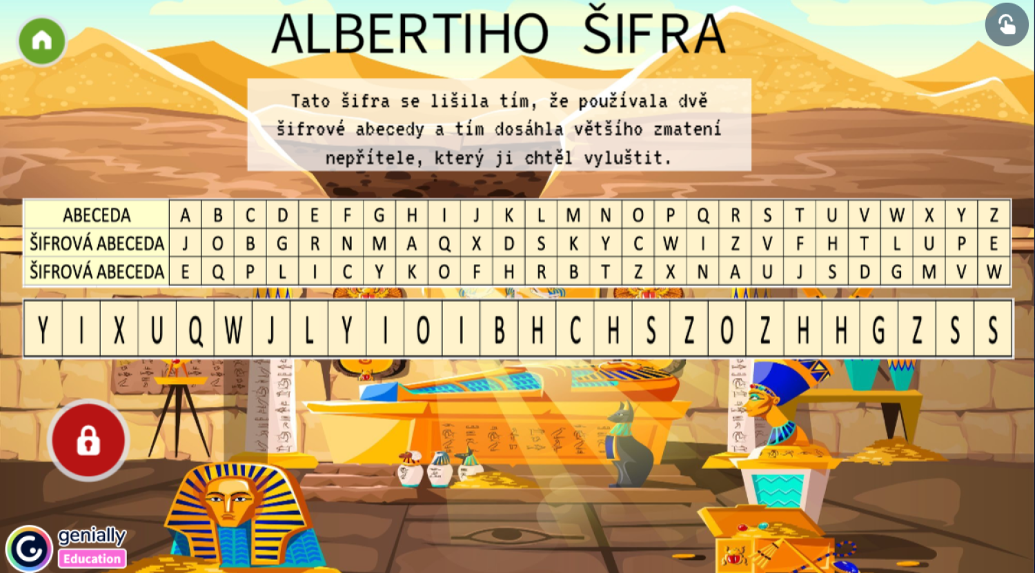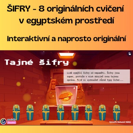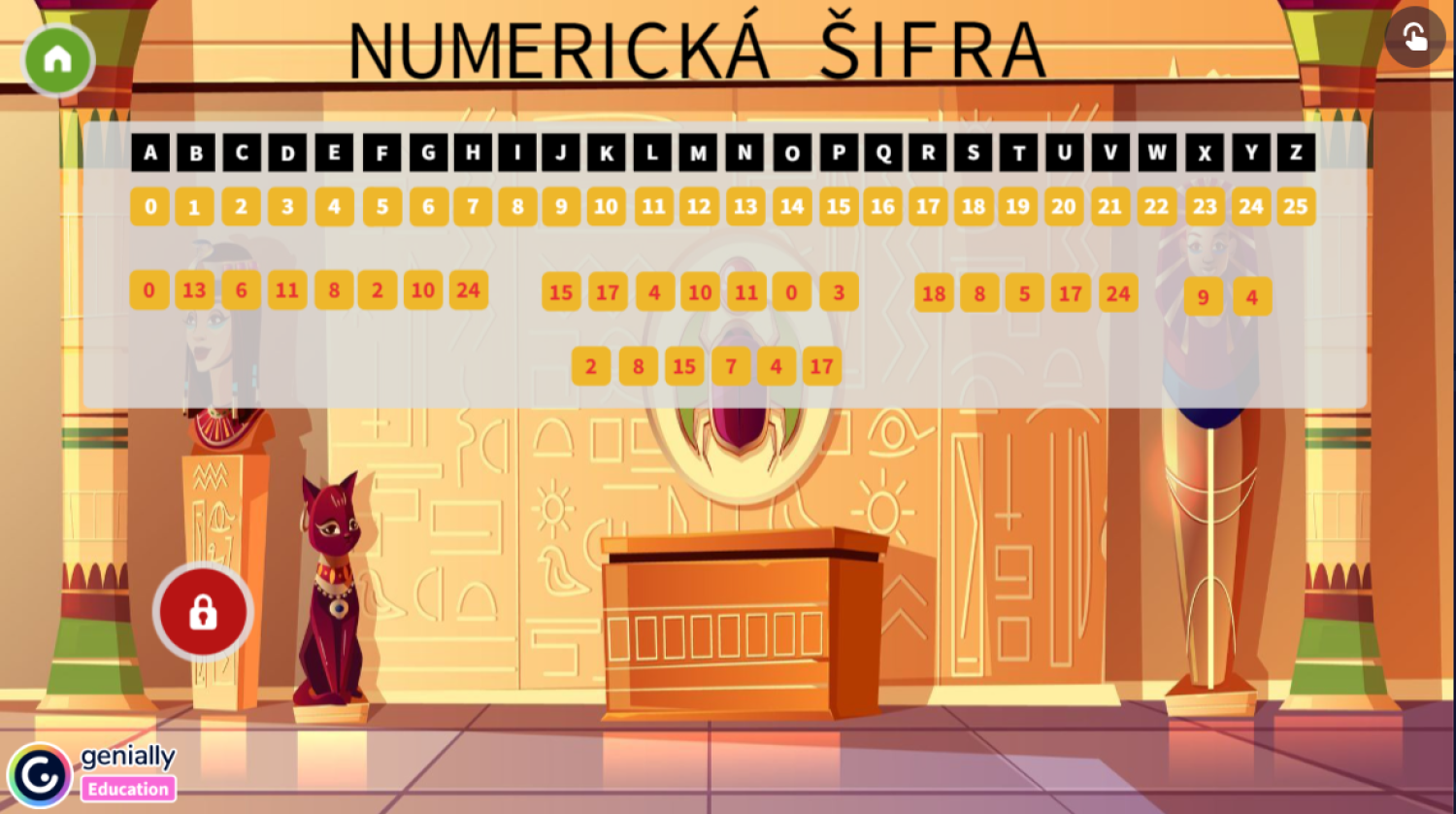 Tematicky jsem se rozhodl pro prostředí Egypta. Žáky bude určitě bavit i to, že jednotlivé prvky (text, tabulky, zámky apod.) různě přilétají, tepou a jinak se hýbají. Pozadí je tedy vždy v egyptském duchu a jednotlivé prvky postupně přiletí.