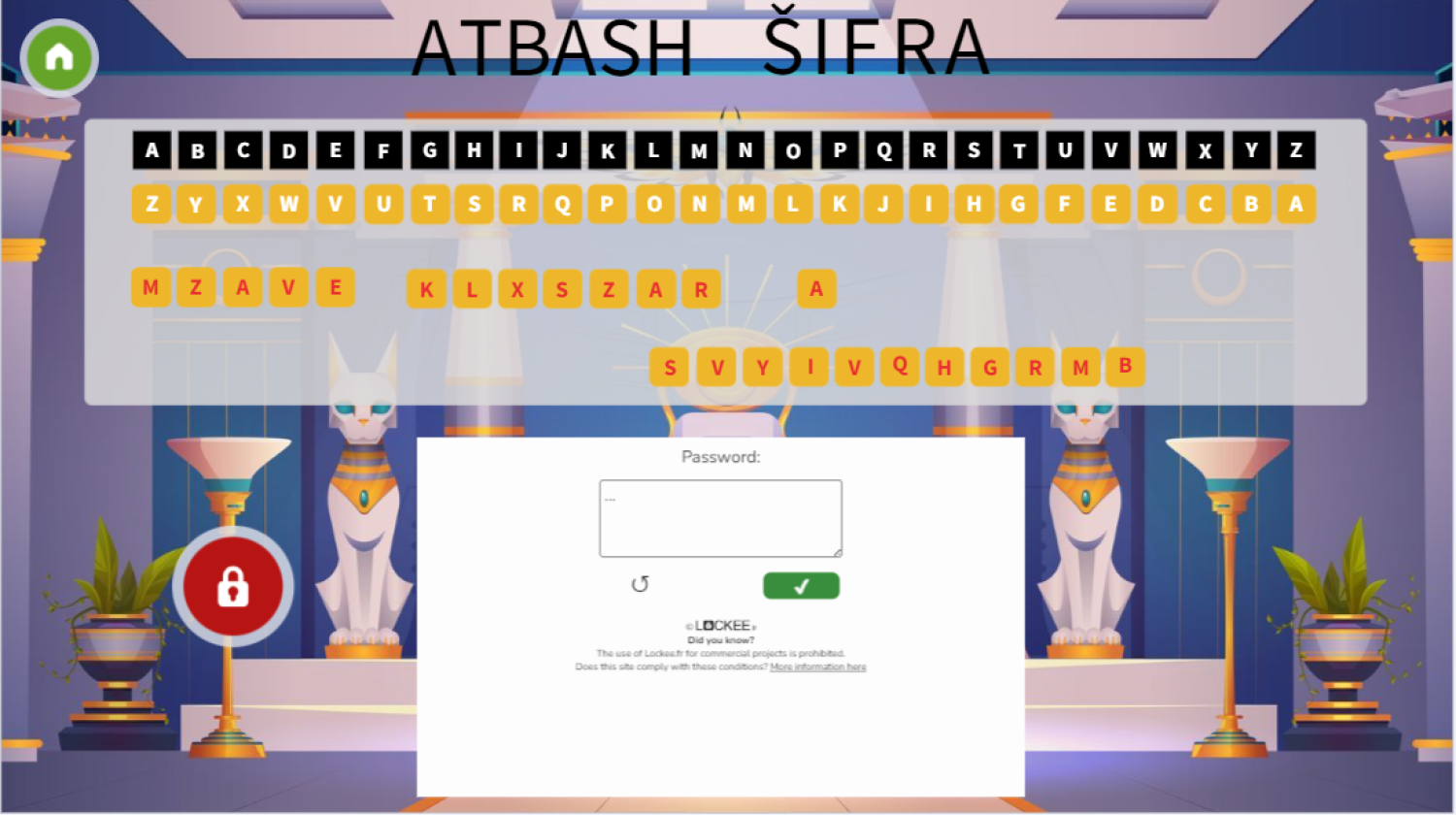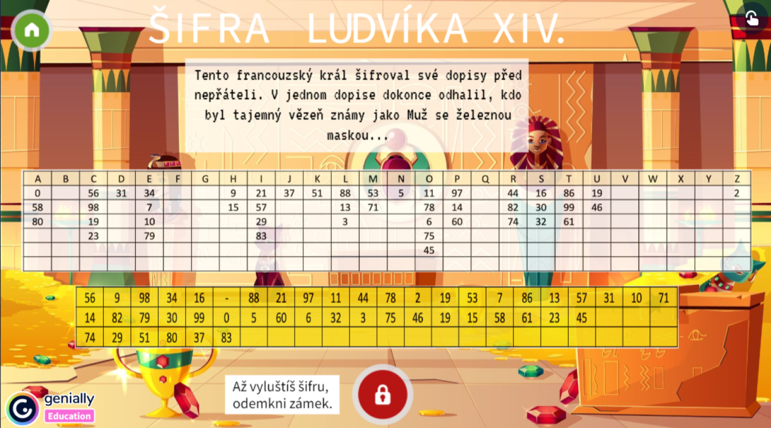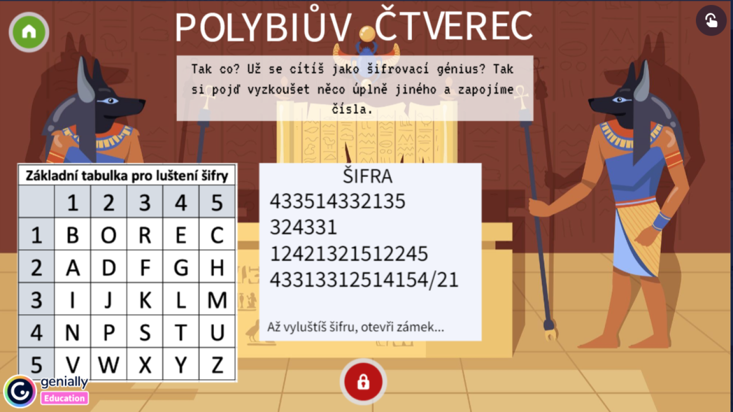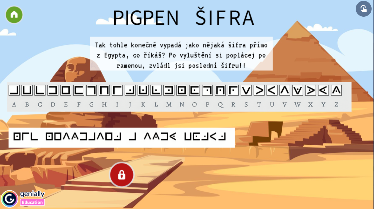 Tematicky jsem se rozhodl pro prostředí Egypta. Žáky bude určitě bavit i to, že jednotlivé prvky (text, tabulky, zámky apod.) různě přilétají, tepou a jinak se hýbají. Pozadí je tedy vždy v egyptském duchu a jednotlivé prvky postupně přiletí.