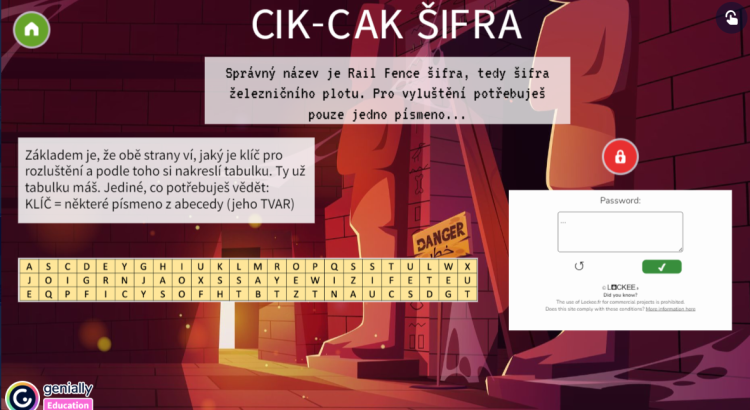 Materiál obsahuje 8 různých typů šifer a je velmi přínosný pro téma Šifrování v rámci Nové informatiky. Doporučuji podívat se na zrychlenou video ukázku.