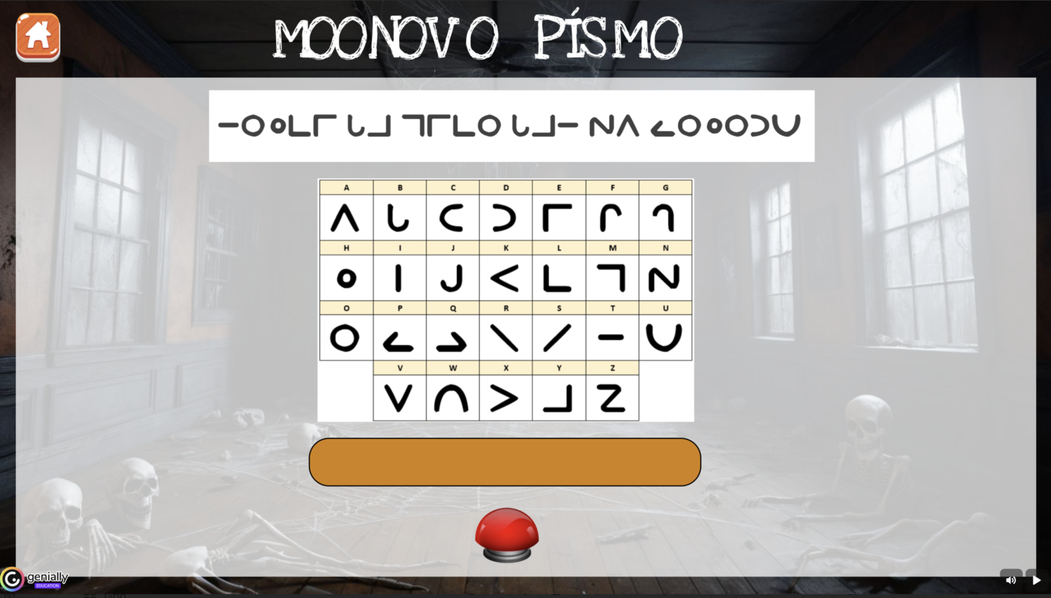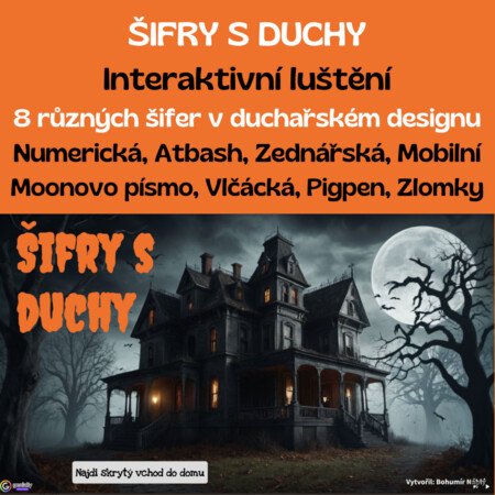 Obsahuje 8 různých typů šifer různé obtížnosti. Je jen na vás, kolik svým žákům napovíte anebo je necháte řešit a přijít na klíč. Tematicky je zaměřen na svátek Dušiček/Halloween, ale dá se samozřejmě použít v průběhu celého roku. K dispozici jsou dvě verze. S tajemnou hudbou v pozadí (dá se vypnout) nebo bez hudby (lepší při slabém internetovém připojení).