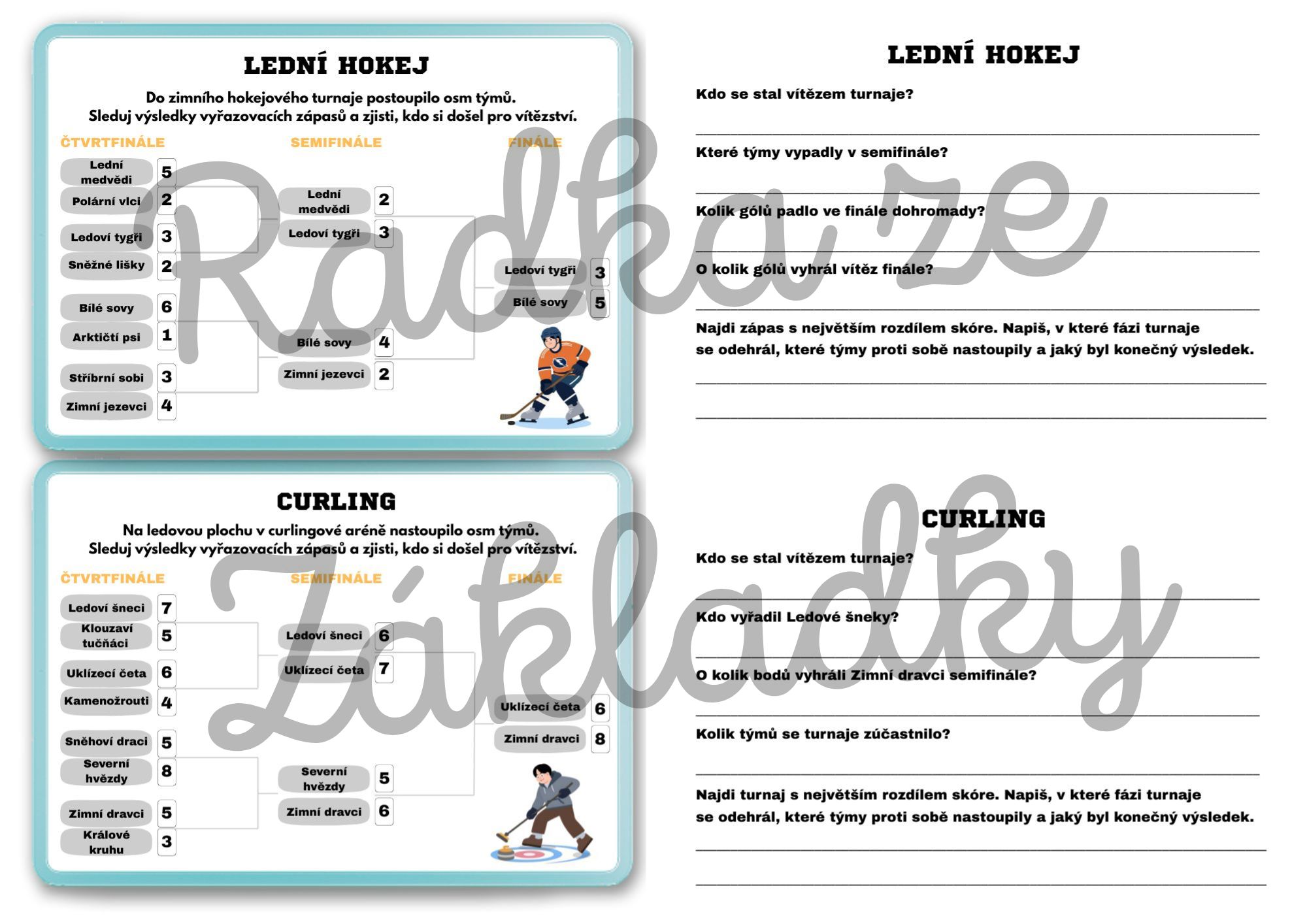 Žáci čtou informace z turnajových pavouků a tabulek, porovnávají výsledky, dopočítávají chybějící hodnoty (časy, součty, rozdíly, body), vyvozují závěry a argumentují na základě dat.