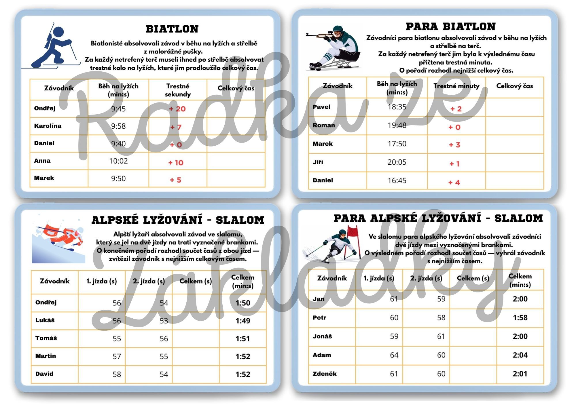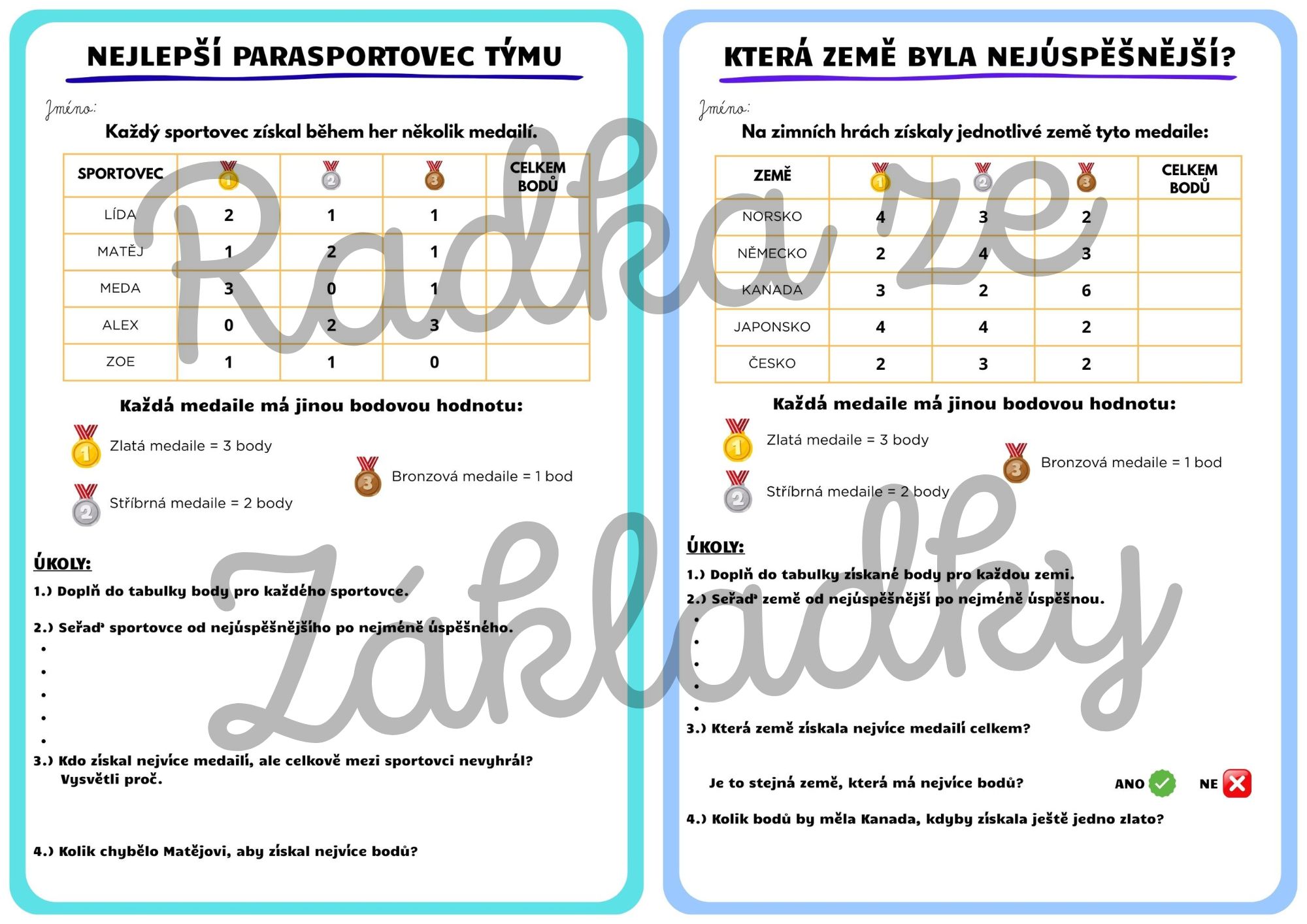 - 2 pracovní listy A4 (vyhodnocování medailí, porovnávání úspěšnosti týmů/závodníků, práce s bodováním).