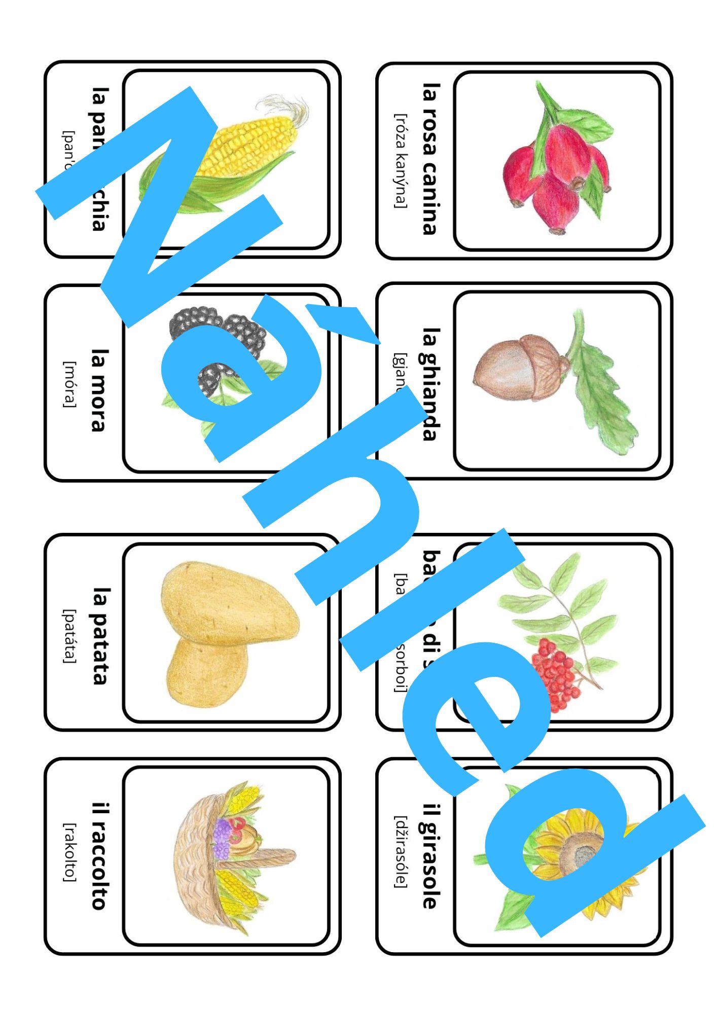 Materiál obsahuje 48 flashcards na téma léto u moře s italskými názvy a výslovností, 6 karet spojovaček název + obrázek