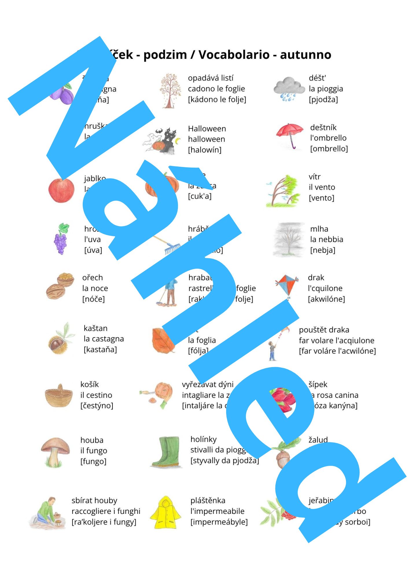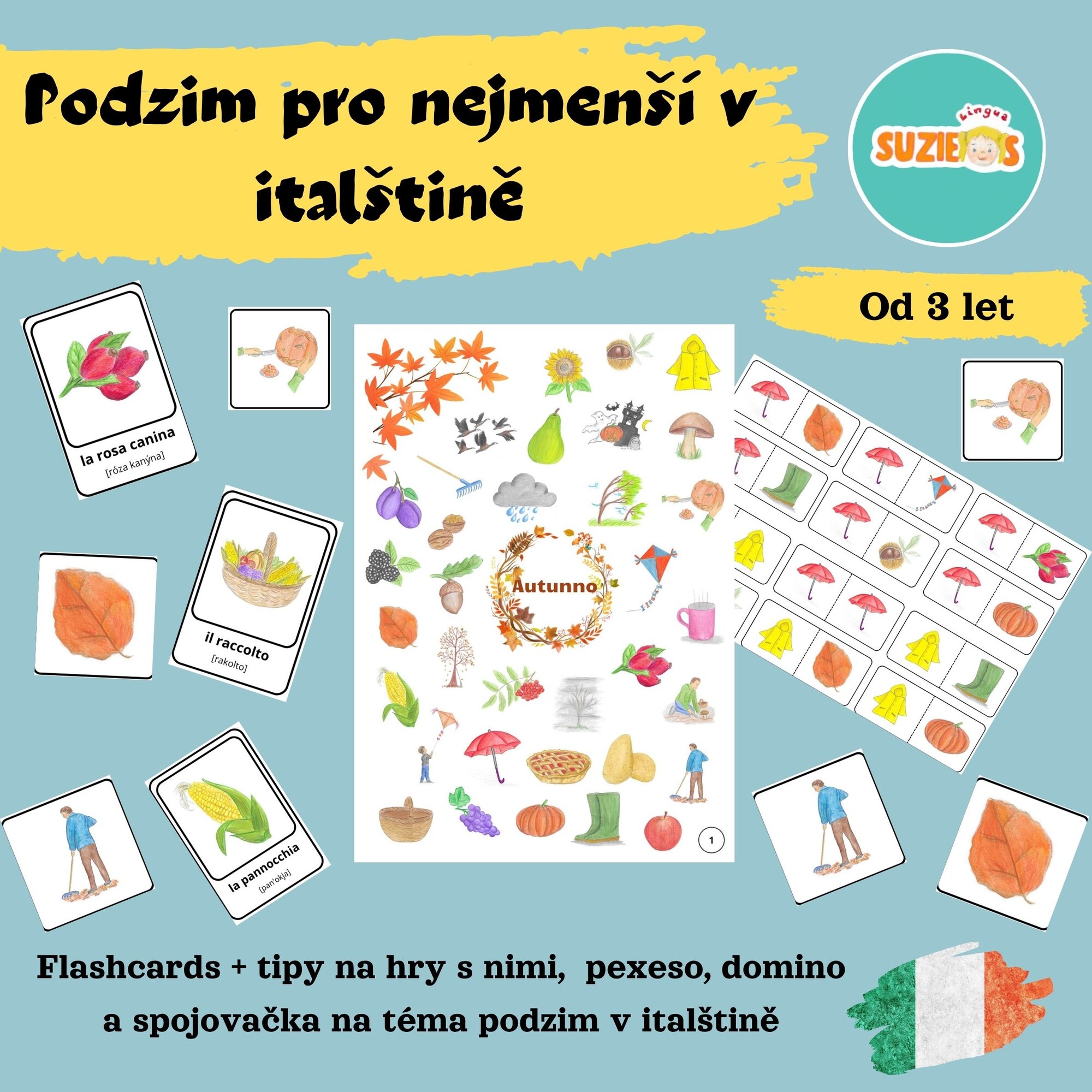Sada aktivit na téma podzim obsahuje flashcards, domino, pexeso, spojovačku, obrázkový slovníček s výslovností a manuál. V manuálu najdete tipy na aktivity s flashcards a jak pracovat se spojovačkami.