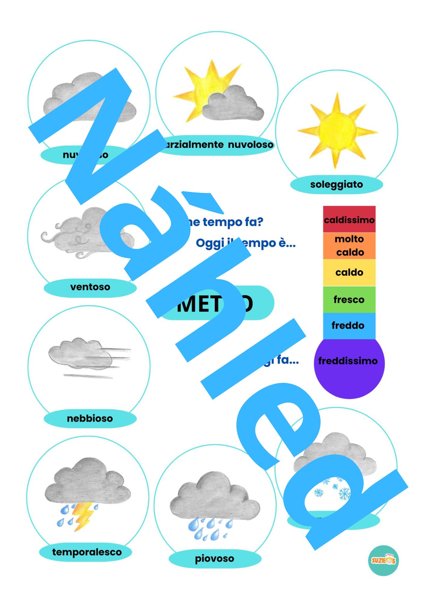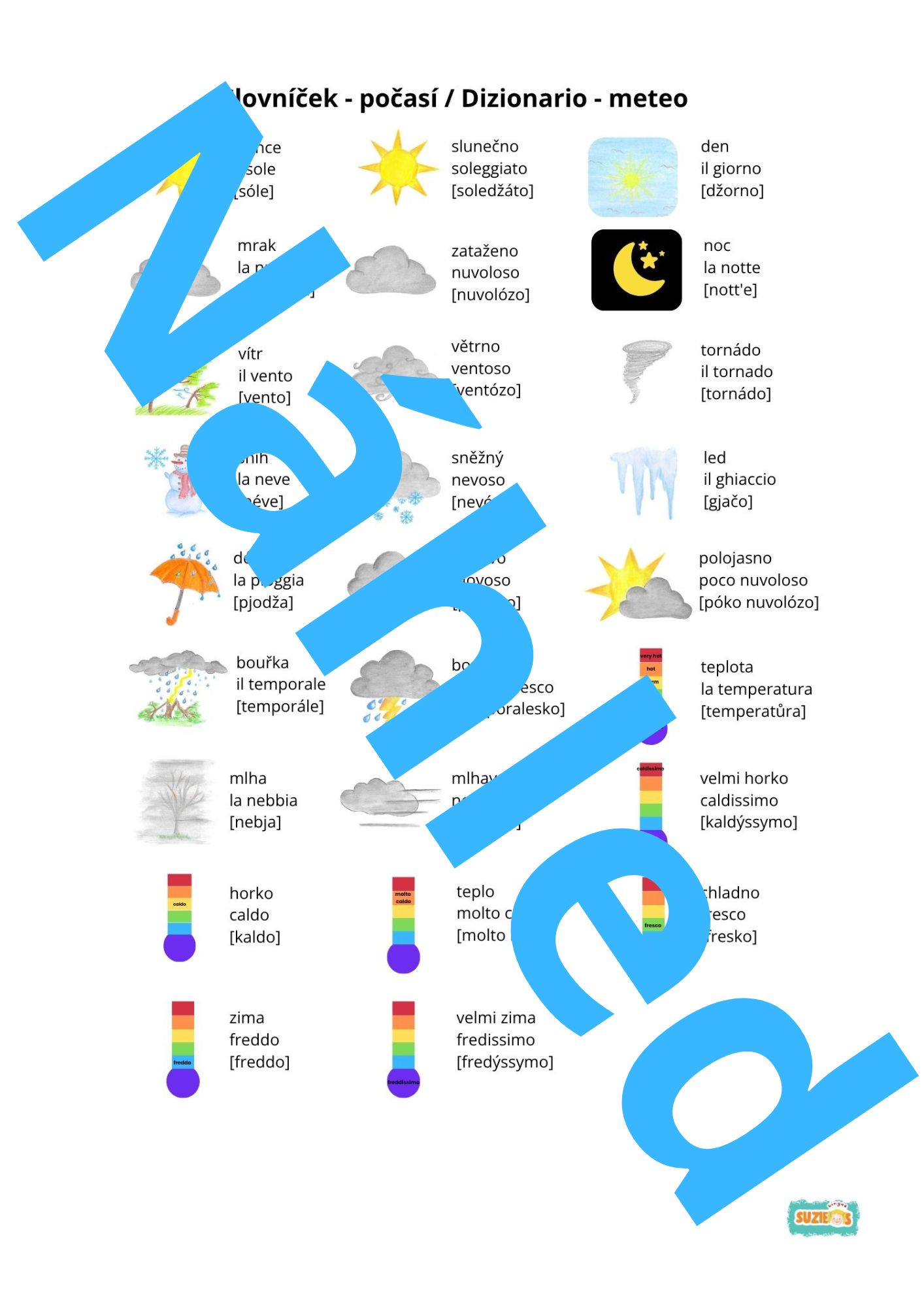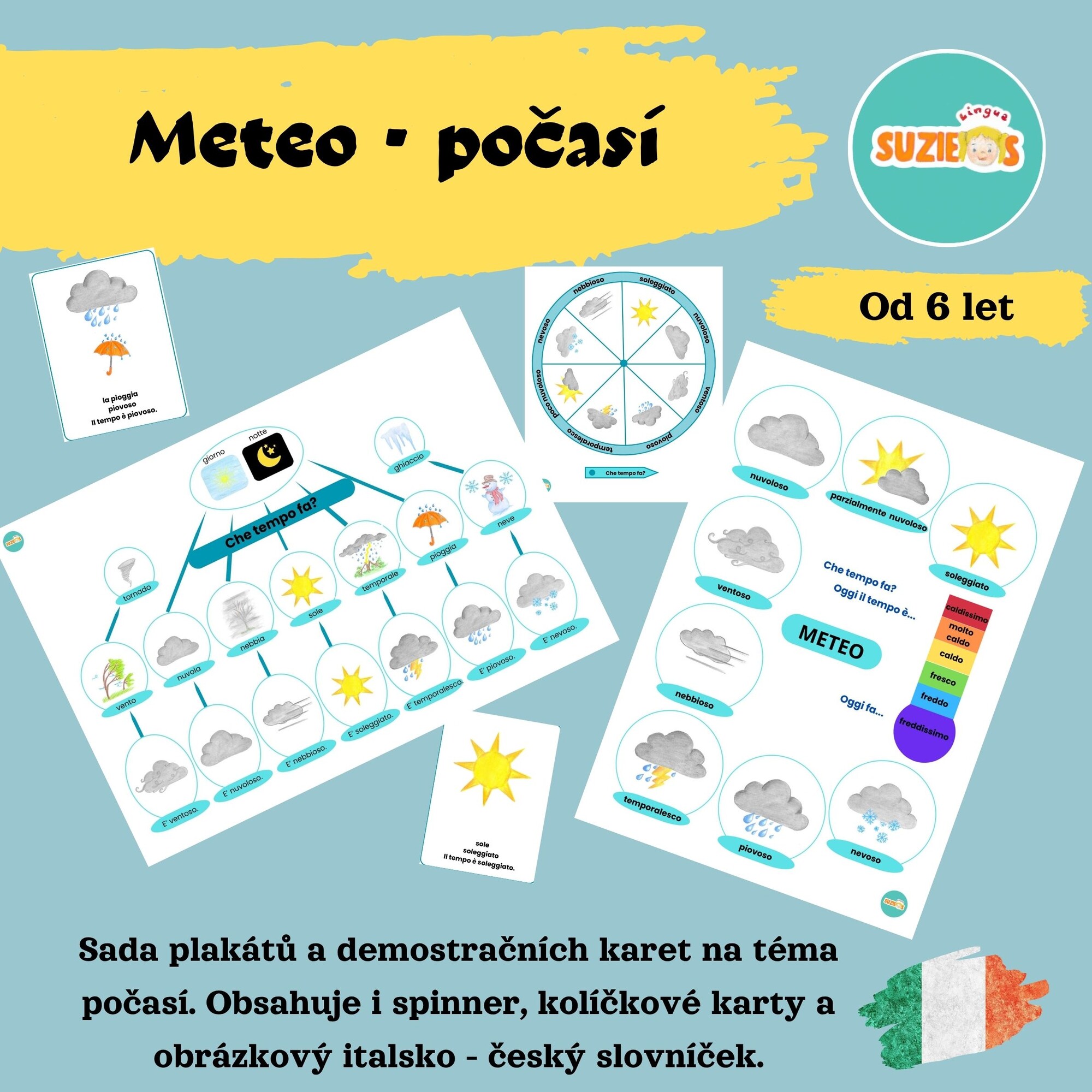 Sada počasí / meteo obsahuje 2 plakáty s přehledem počasí, 10 demonstrační karet, spinner, kolíčkové karty, obrázkový slovník s výslovností a manuál jak se sadou pracovat.