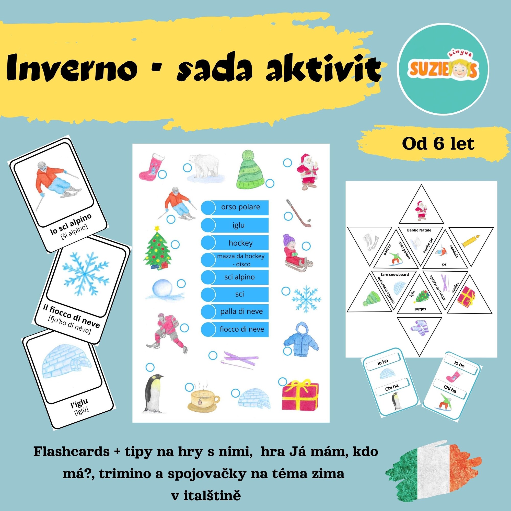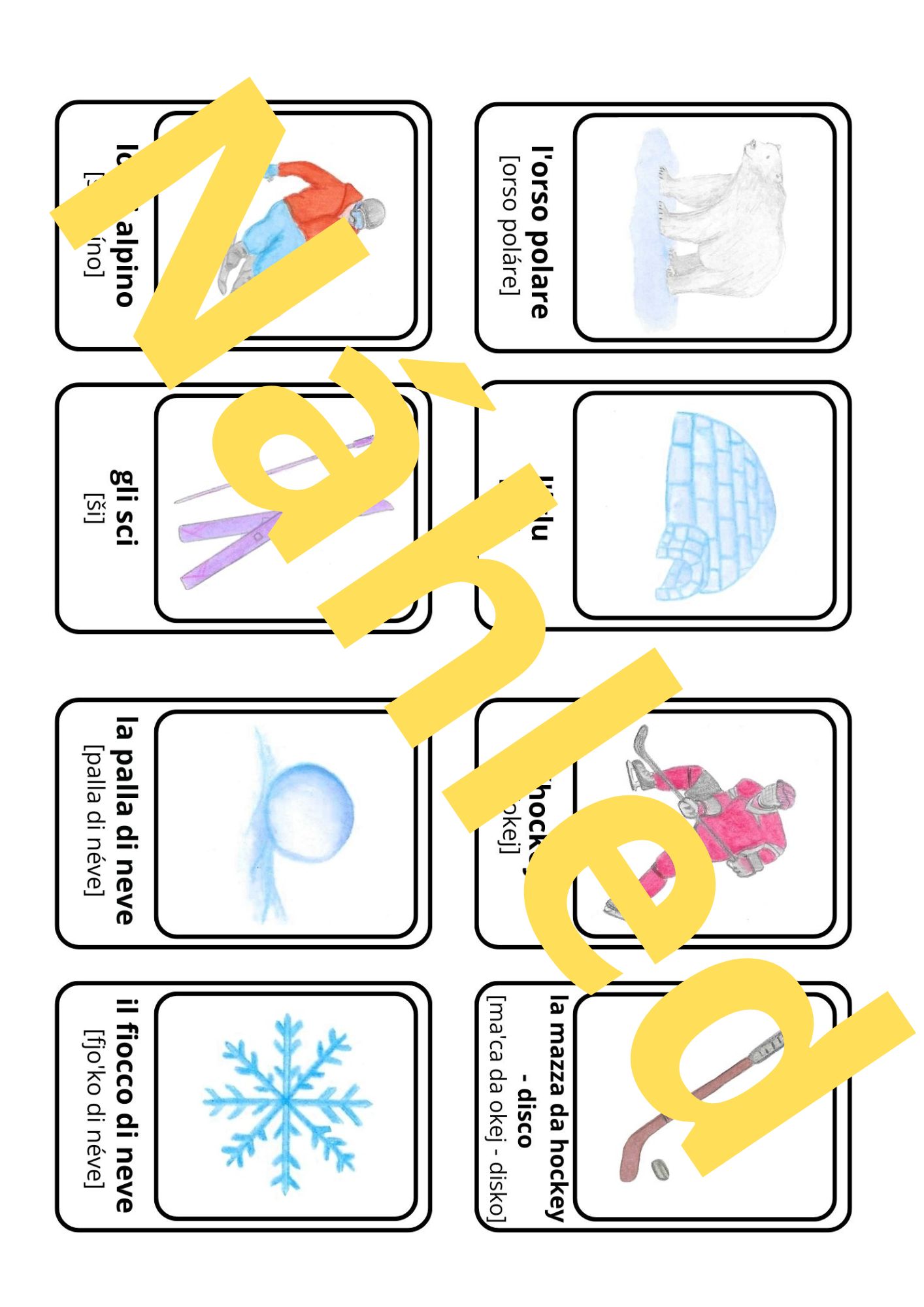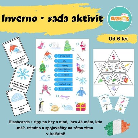 Materiál na téma zima v italštině obsahuje 40 flashcards s výslovností, aktivity k flashcards, hru Já mám, kdo má?, 4 trimina, 5 spojovaček, obrázkový slovníček s výslovností a manuál.