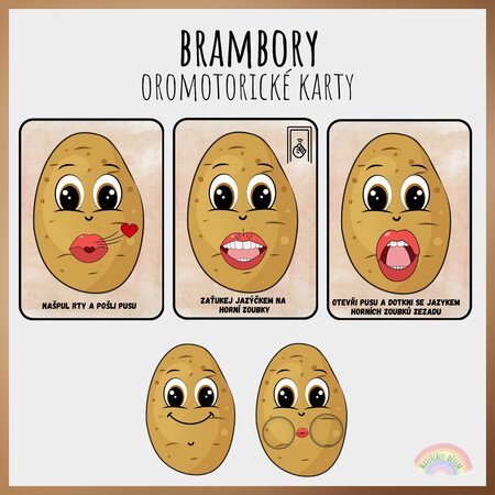 Soubor obsahuje 10 oromotorických karet na téma Brambory. Každá kartička znázorňuje a popisuje jednoduchý cvik k procvičení motoriky mluvidel.