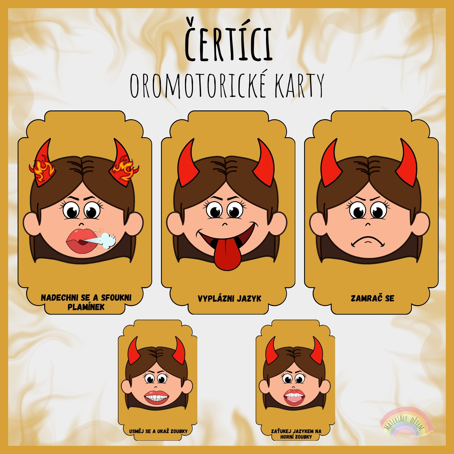 Soubor obsahuje 10 oromotorických karet na téma Čerti. Každá kartička znázorňuje a popisuje jednoduchý cvik k procvičení motoriky mluvidel.