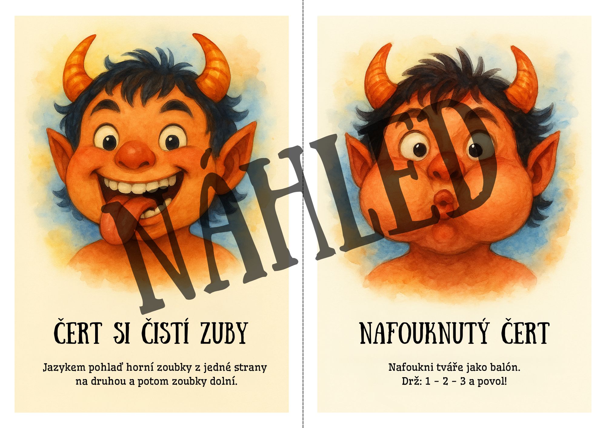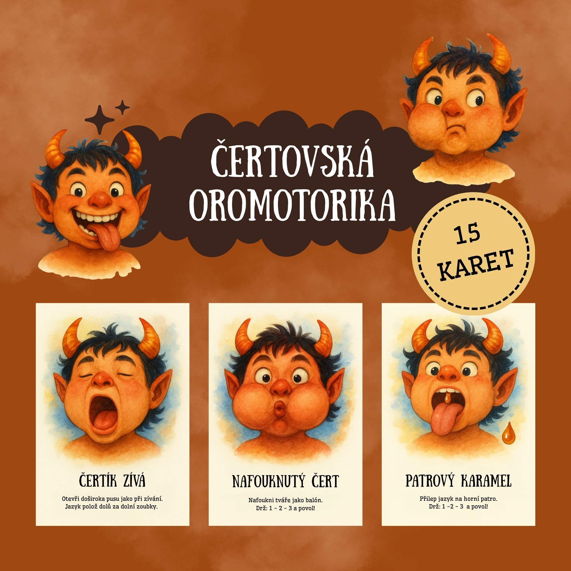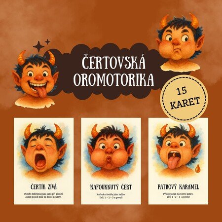 Soubor obsahuje 15 karet velikosti A5 pro procvičování motoriky mluvidel, které je zásadní pro rozvoj mluvené řeči. Na každé kartě je zobrazen obrázek čerta naznačující konkrétní oromotorický cvik i s popisem.