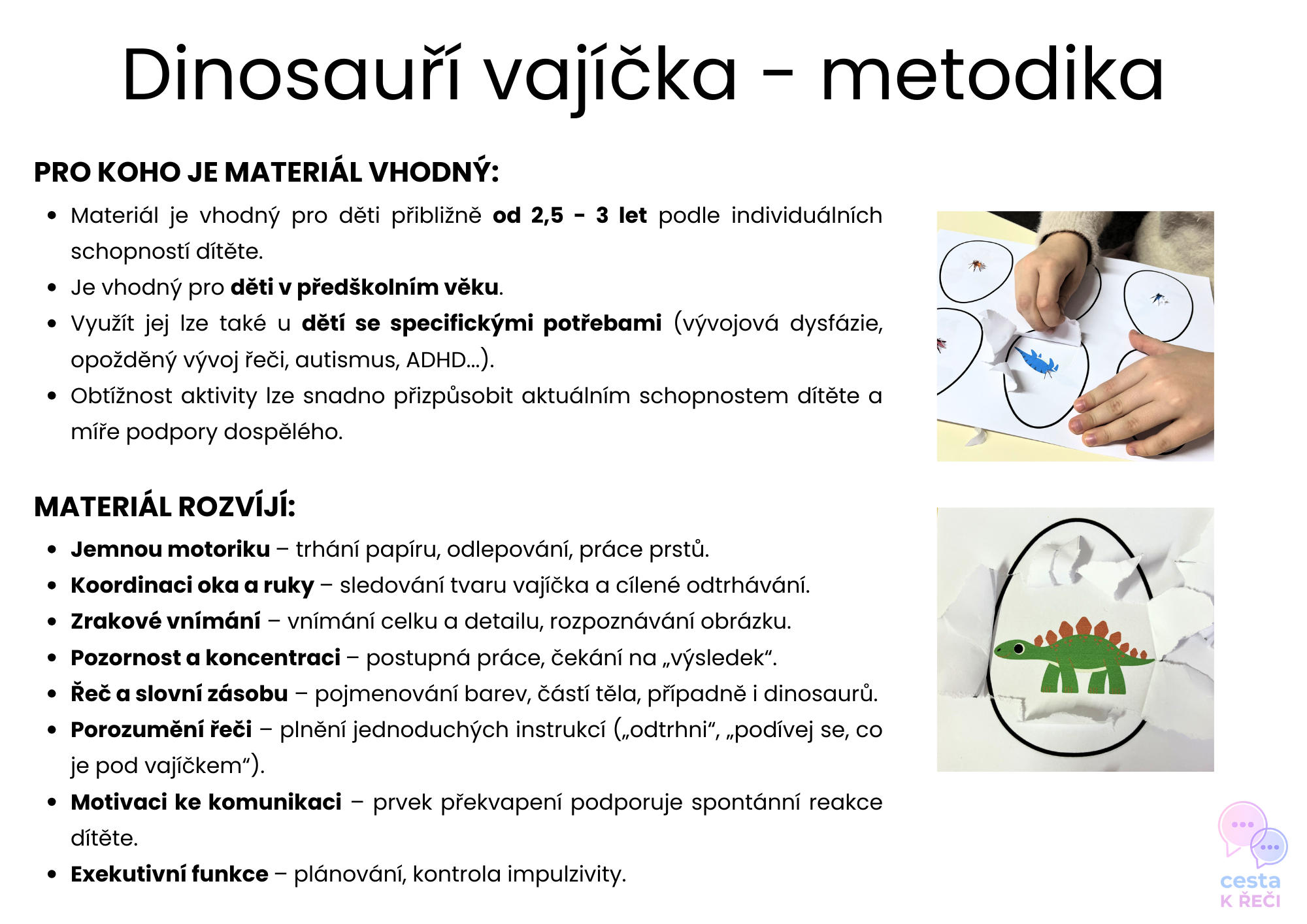 Dinosauří vajíčka jsou ideální jako zábavná aktivita na doma – pro smysluplné zabavení dětí bez obrazovek, ale také jako doplněk do mateřské školy, logopedické péče či speciální pedagogiky. Skvěle se hodí pro individuální práci i malé skupinky a nabízí řadu možností dalšího rozšiřování (povídání, třídění, počítání, příběhy).