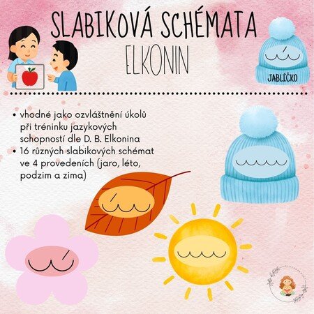 Soubor obsahuje 16 různých slabikových schemat, a to ve 4 tematických provedeních – jaro, léto, podzim a zima. Celkem tak získáte variabilní materiál, který můžete využívat během celého roku bez toho, aby dětem rychle zevšedněl.